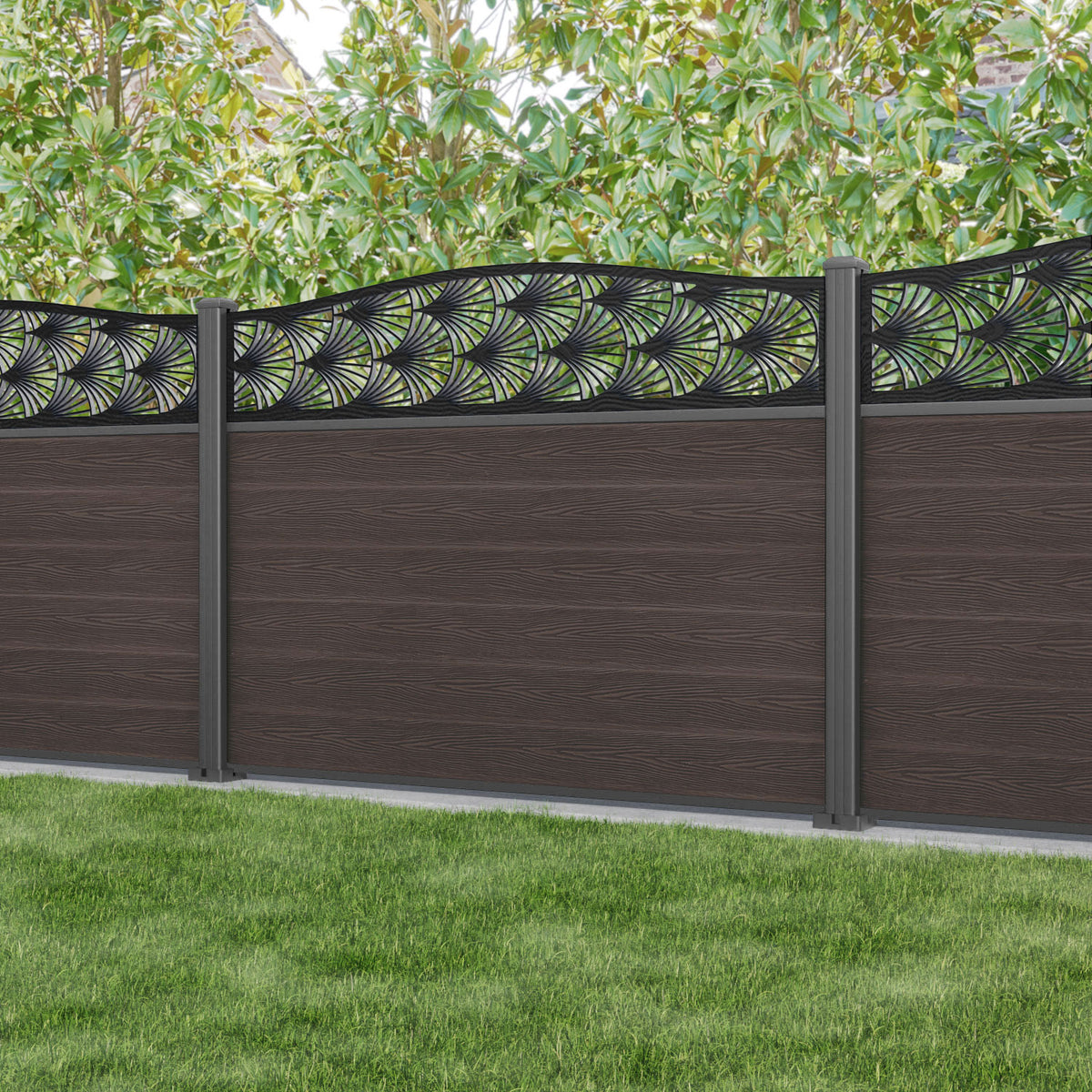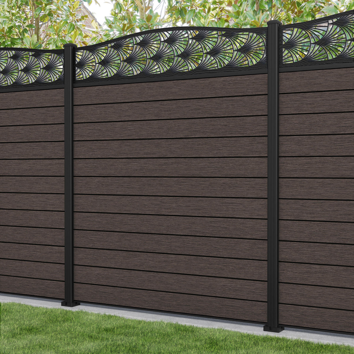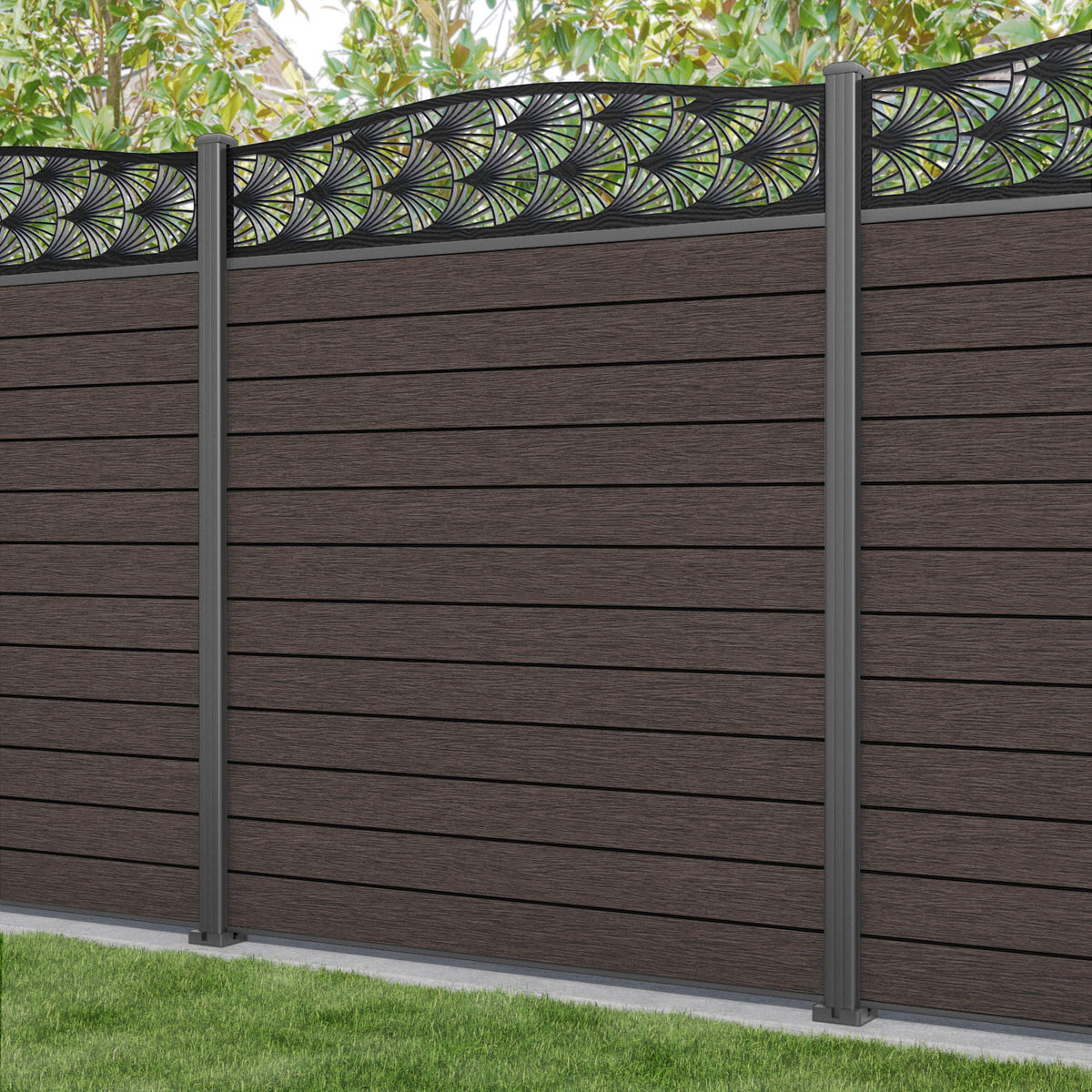 Fusion Laurel Curved Top Fence Panel Mid Brown - with our aluminium posts