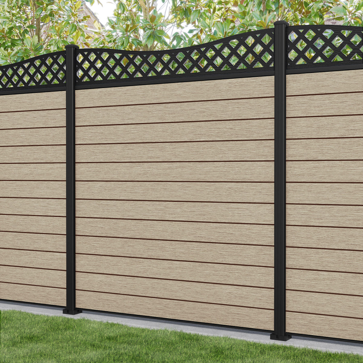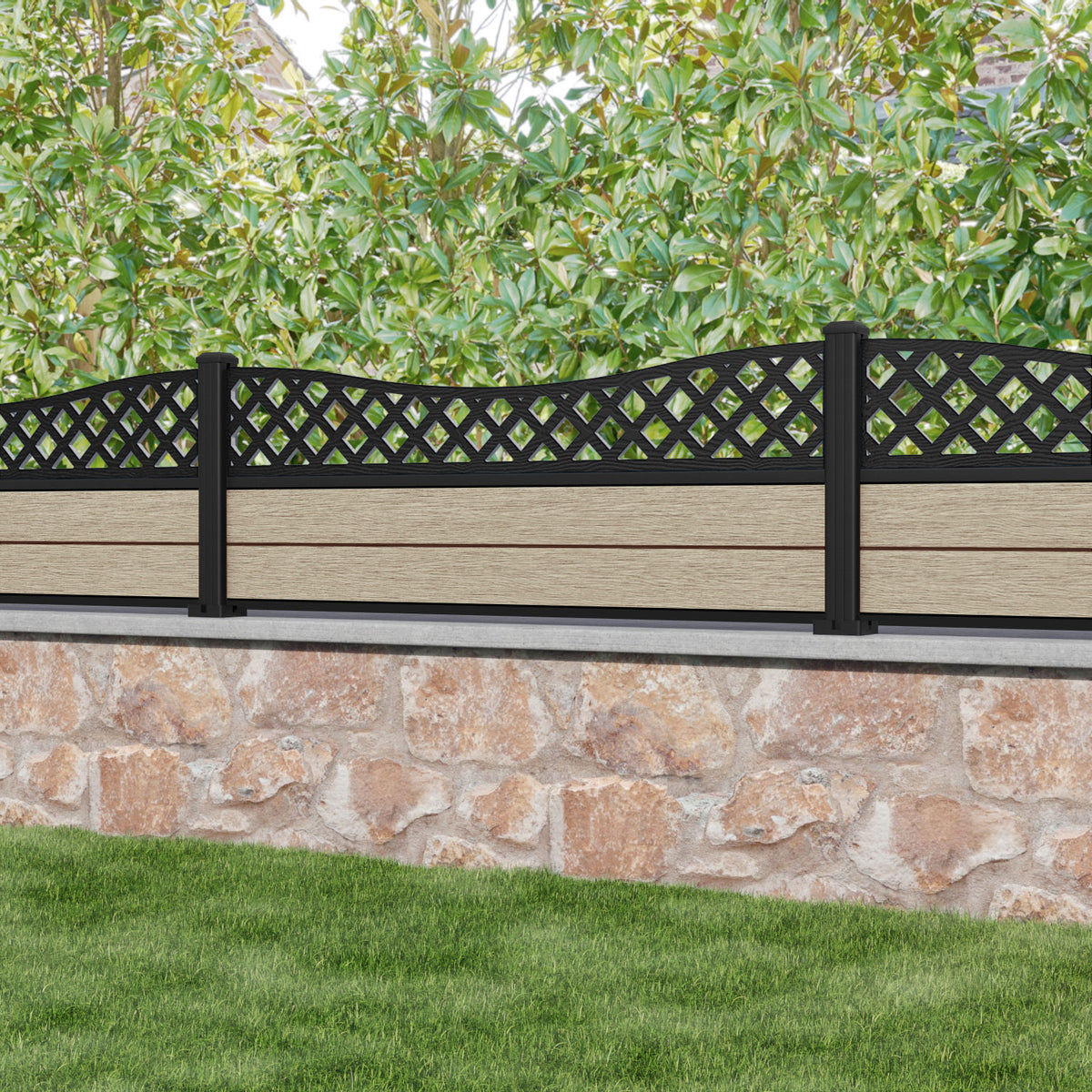 Fusion Low Wave Fence Panel Light Oak - with our aluminium posts