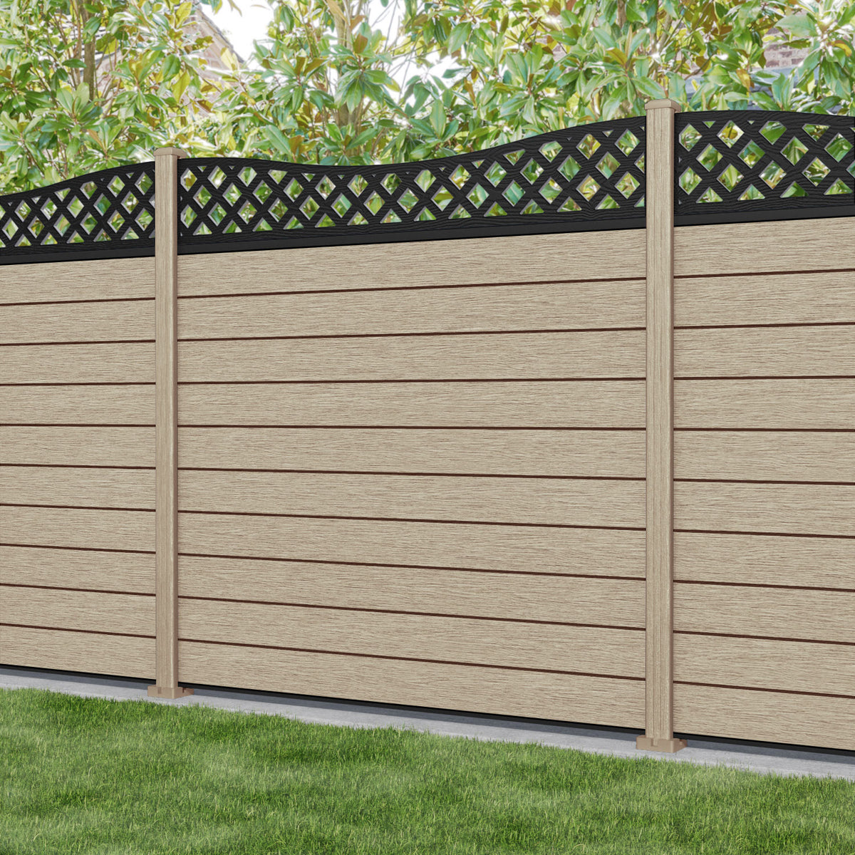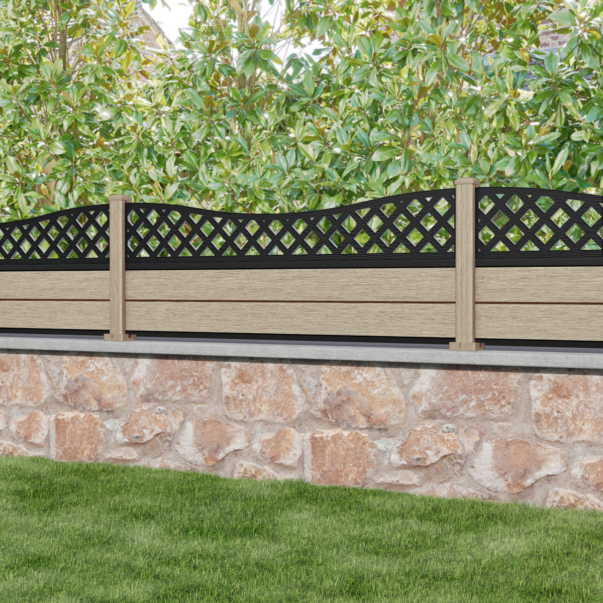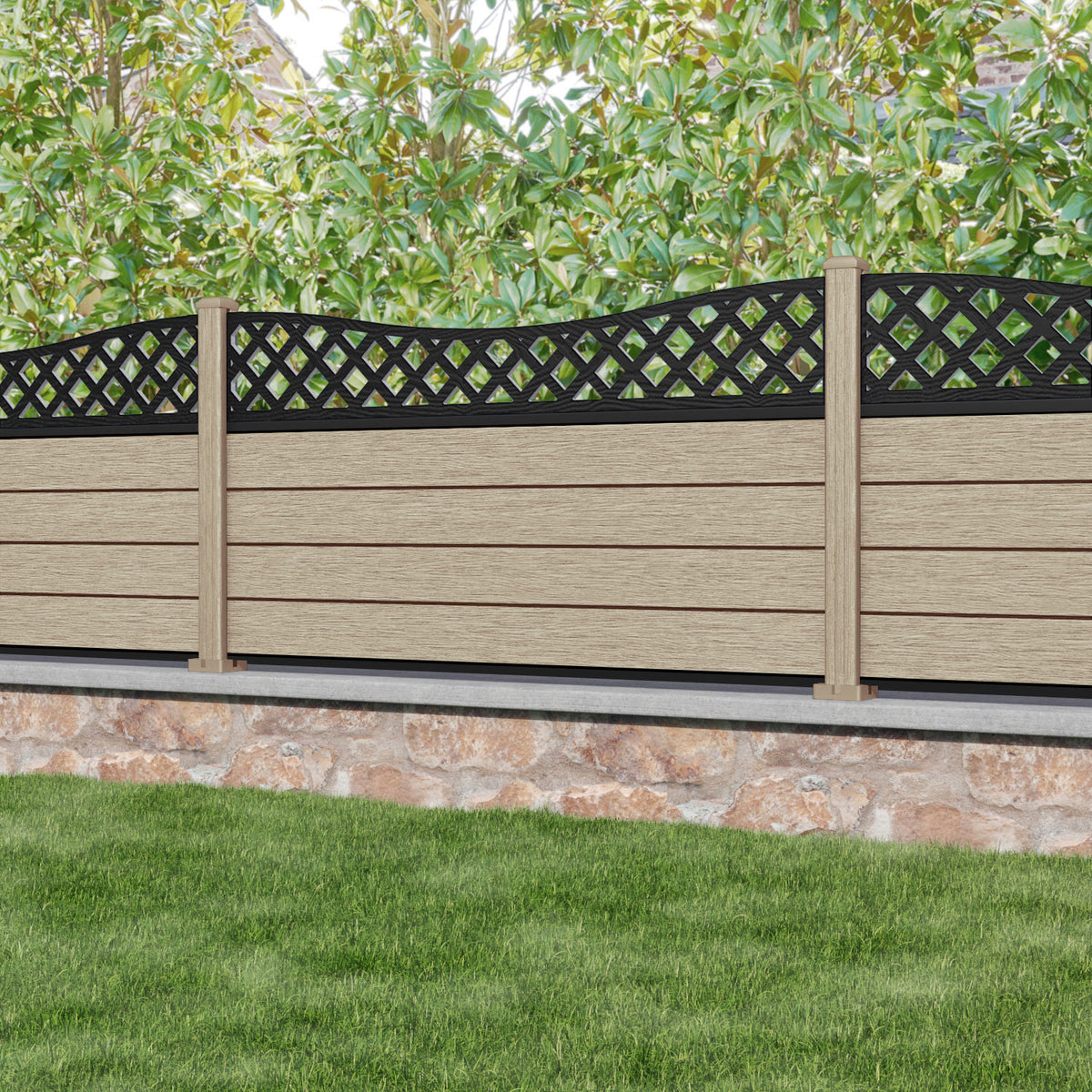 Fusion Low Wave Fence Panel Light Oak - with our composite posts