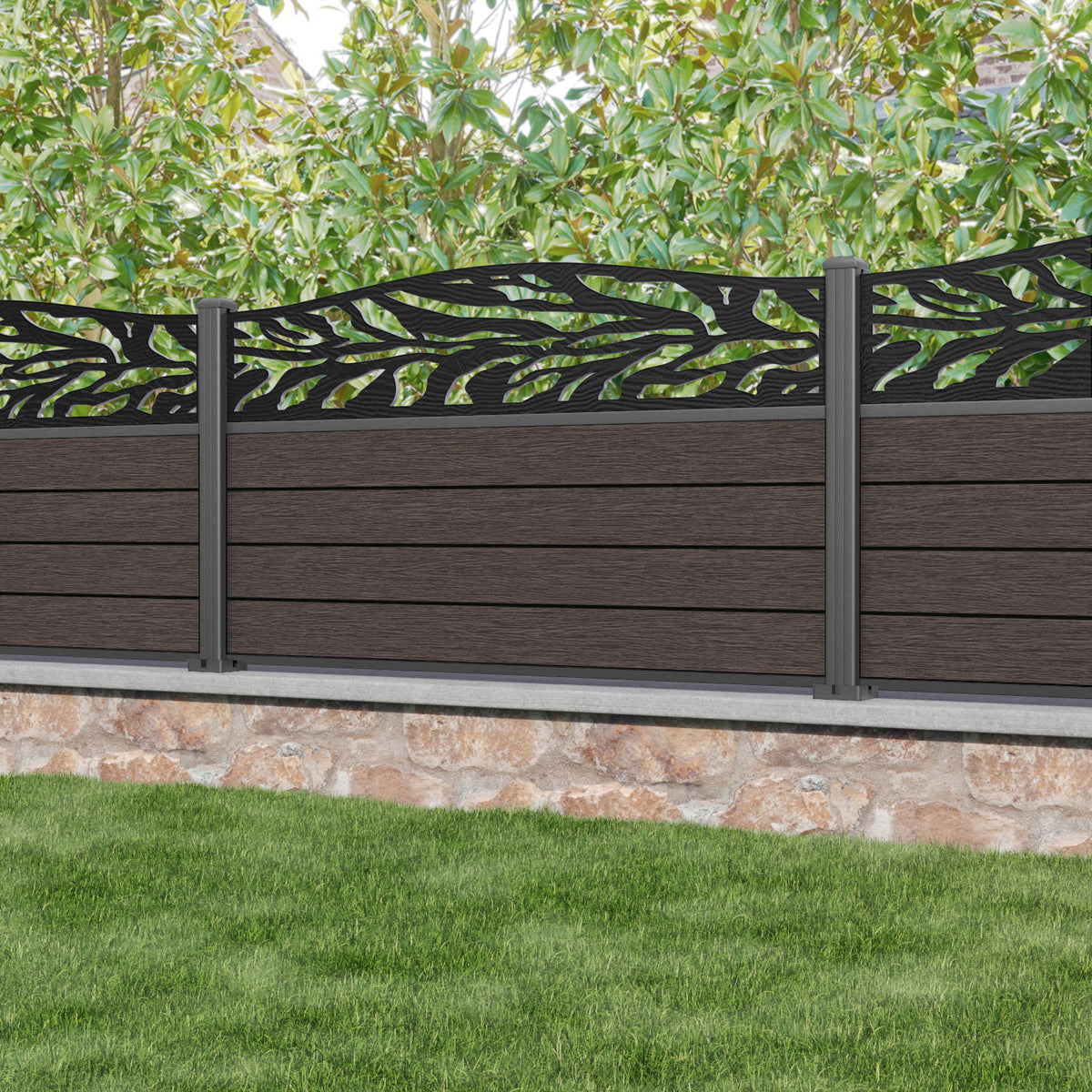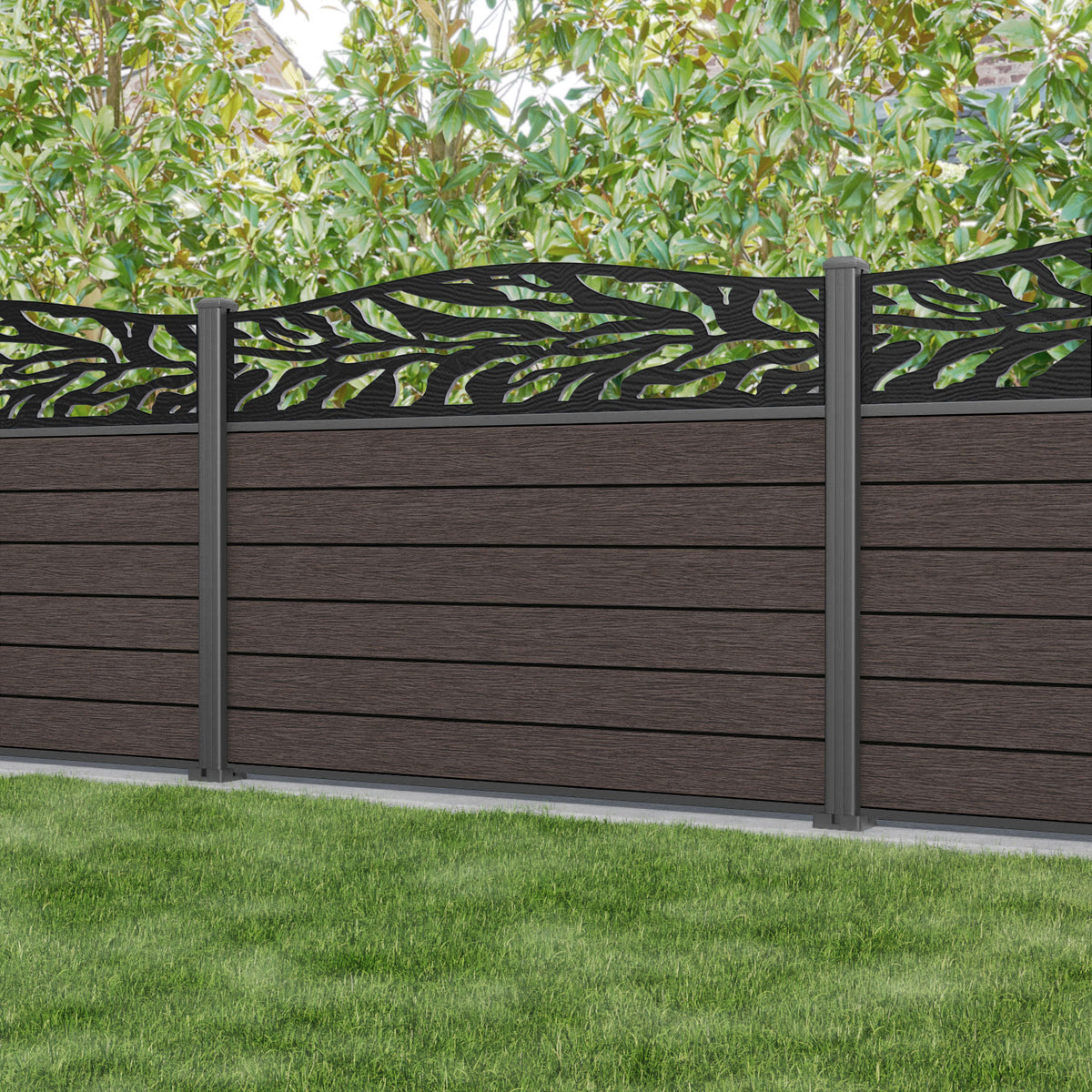Fusion Malawi Curved Top Fence Panel Mid Brown - with our aluminium posts