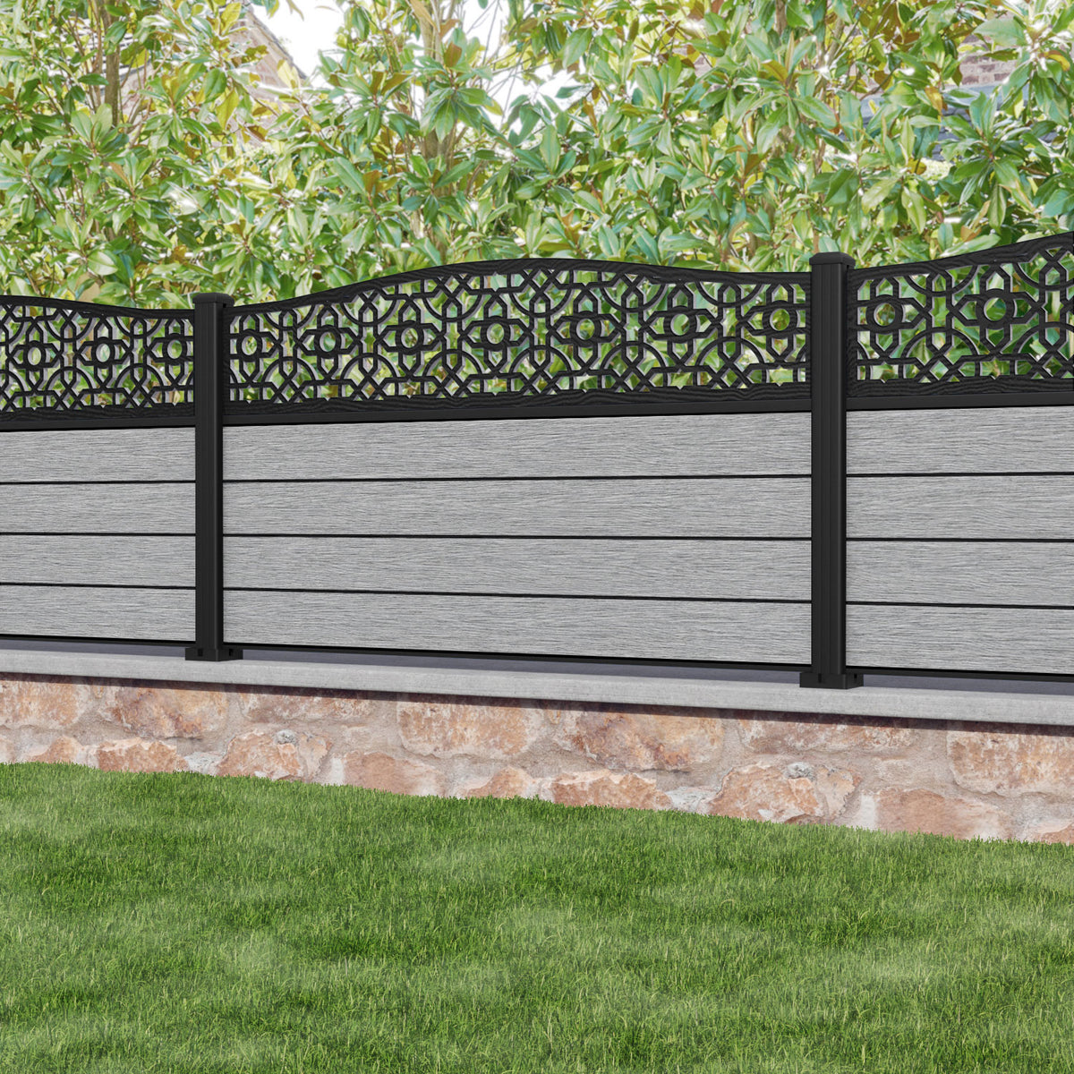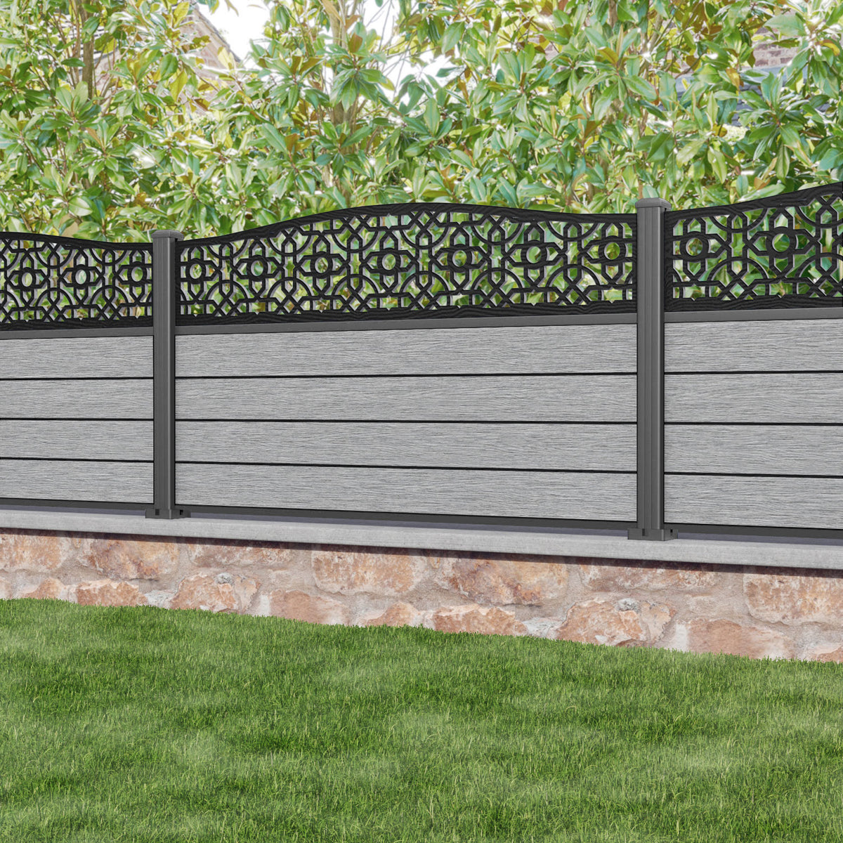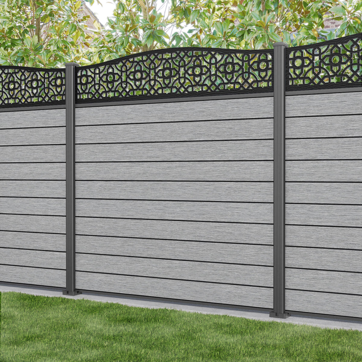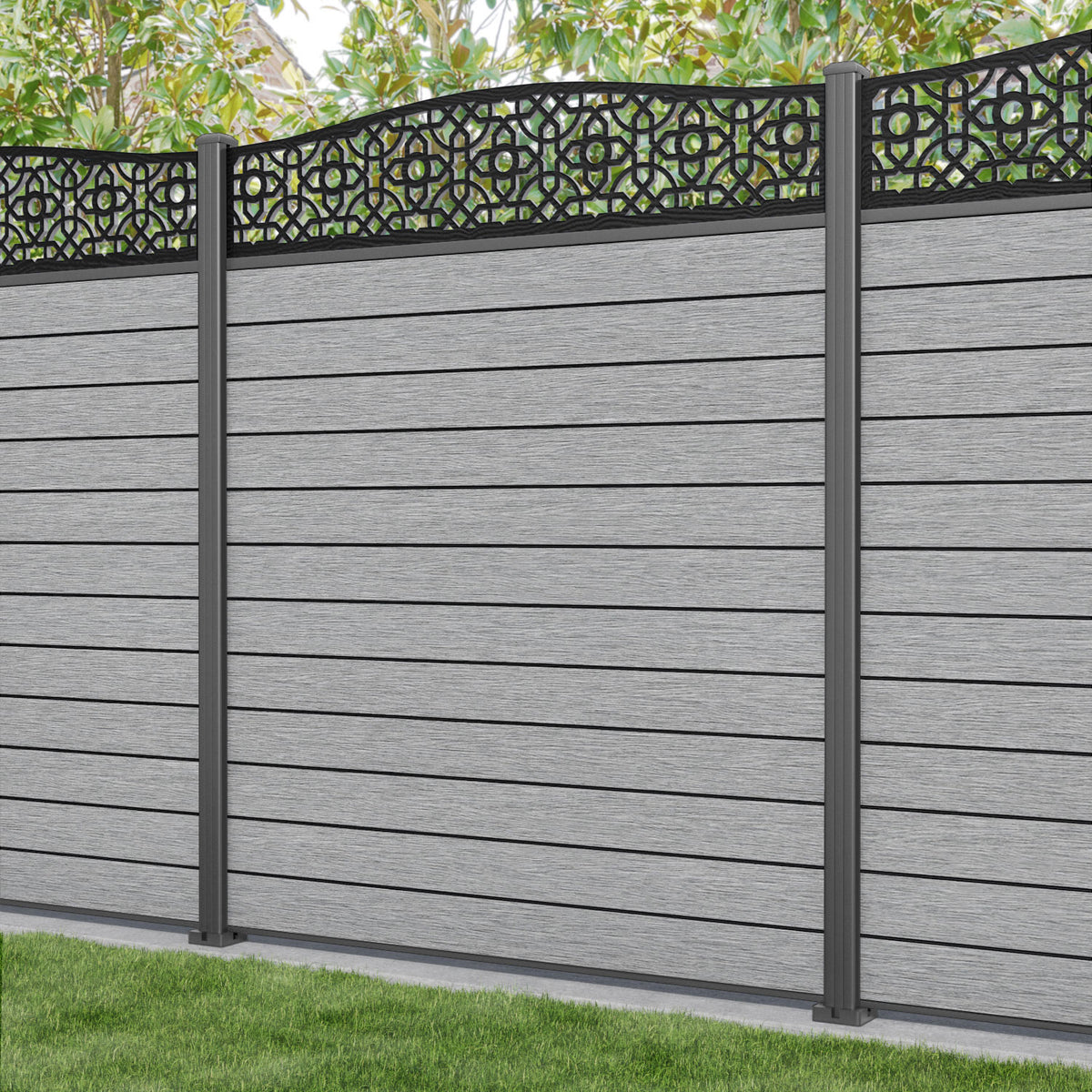 Fusion Nabila Curved Top Fence Panel Light Grey - with our aluminium posts