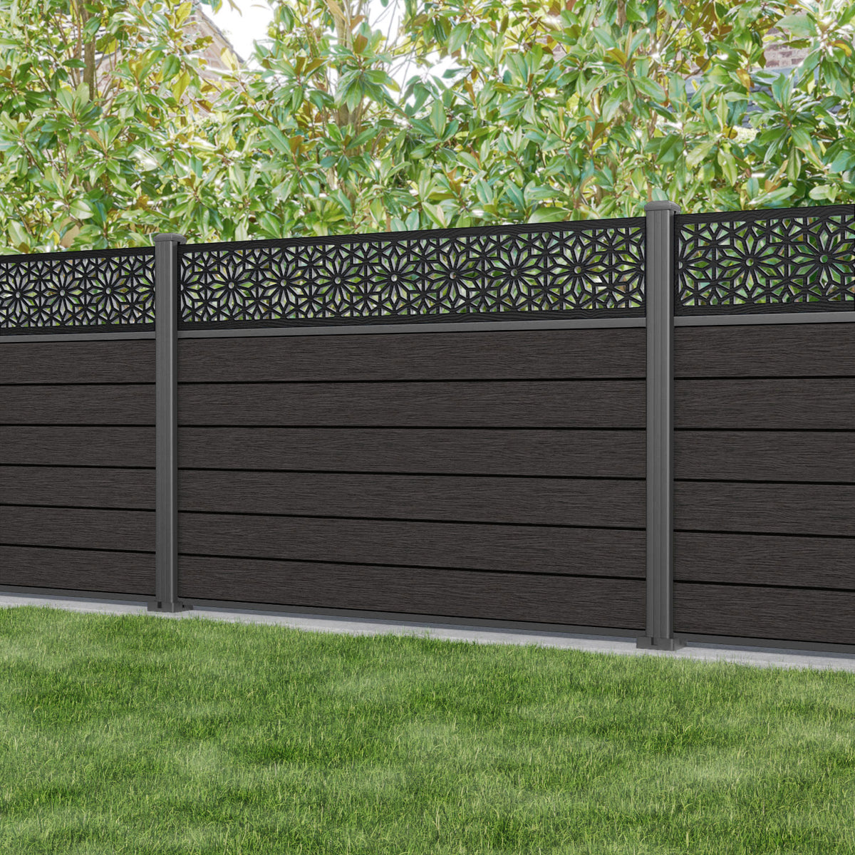 Fusion Narwa Fence Panel Dark Oak - with our aluminium posts
