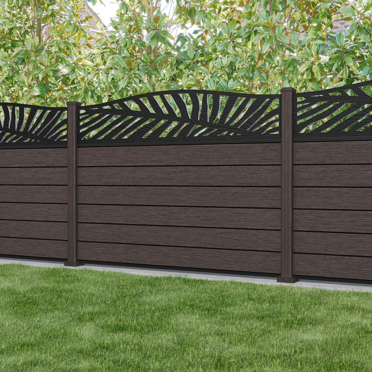 Fusion Palm Curved Top Fence Panel Mid Brown - with our composite posts