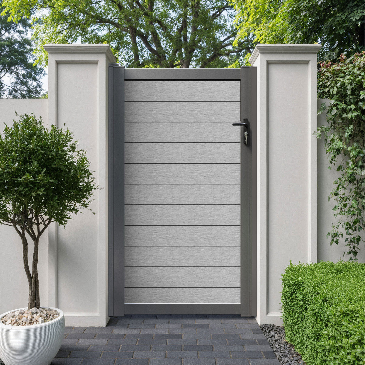 Pair your gate with our eco-friendly composite or aluminium slats for a seamless match to our fencing collections, ensuring a stylish and cohesive look.
