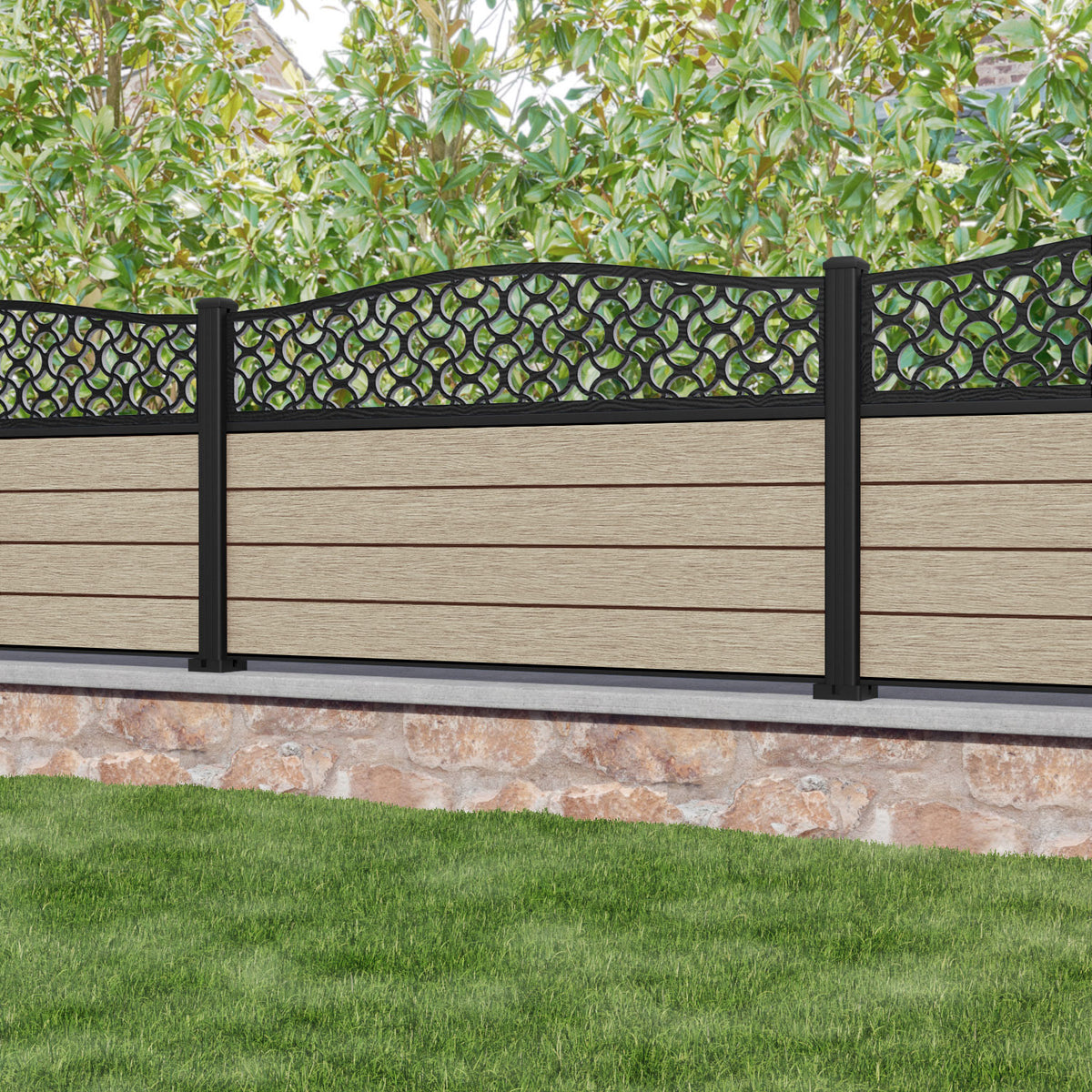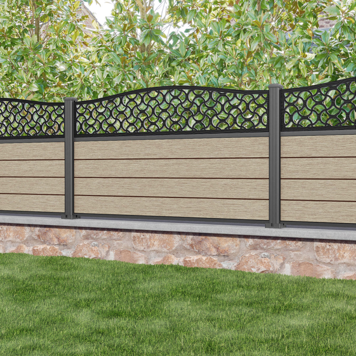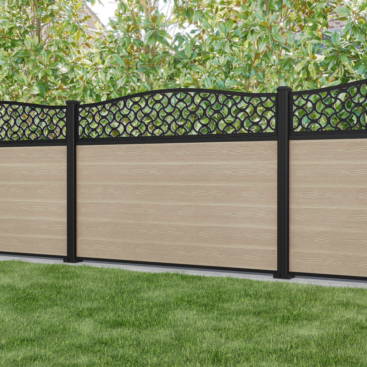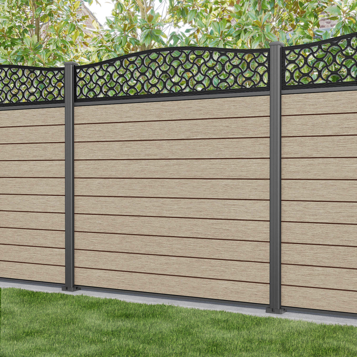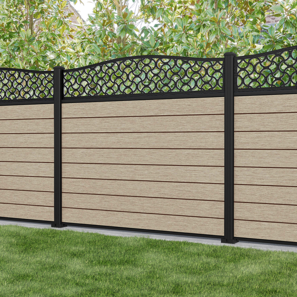 Fusion Vida Curved Top Fence Panel Light Oak - with our aluminium posts