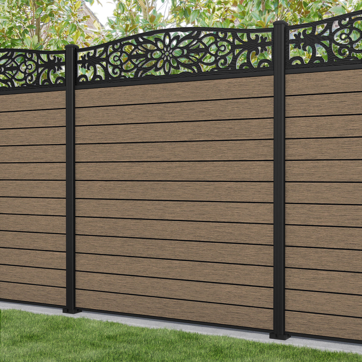 Fusion Windsor Curved Top Fence Panel Teak - with our aluminium posts