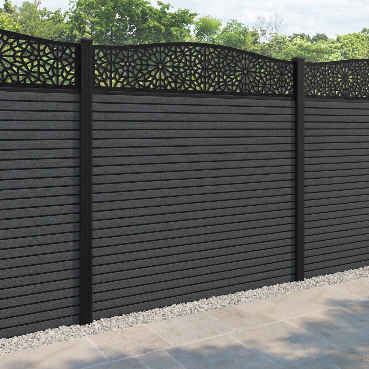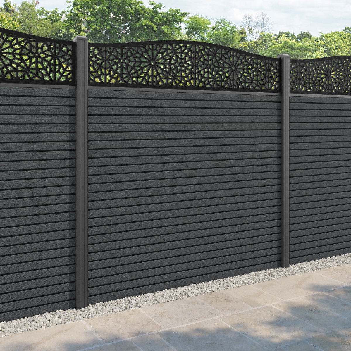 Hudson Alnara Curved Top Fence Panel Dark Grey - with our aluminium posts