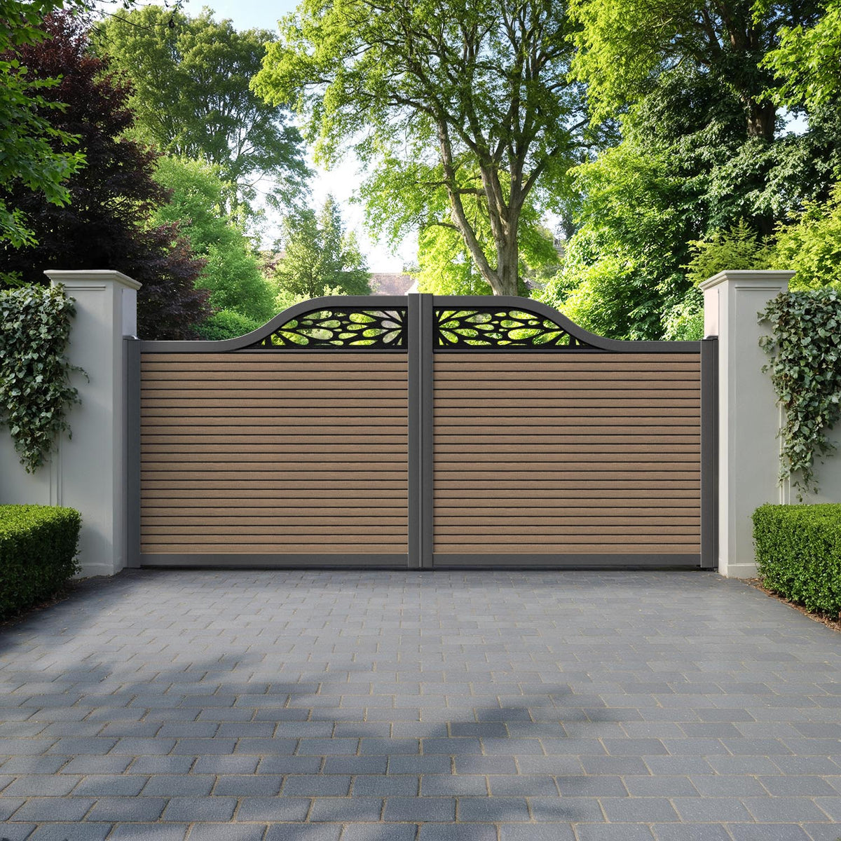 Hudson Blossom Curved Top Driveway Gate Teak - Top Screen