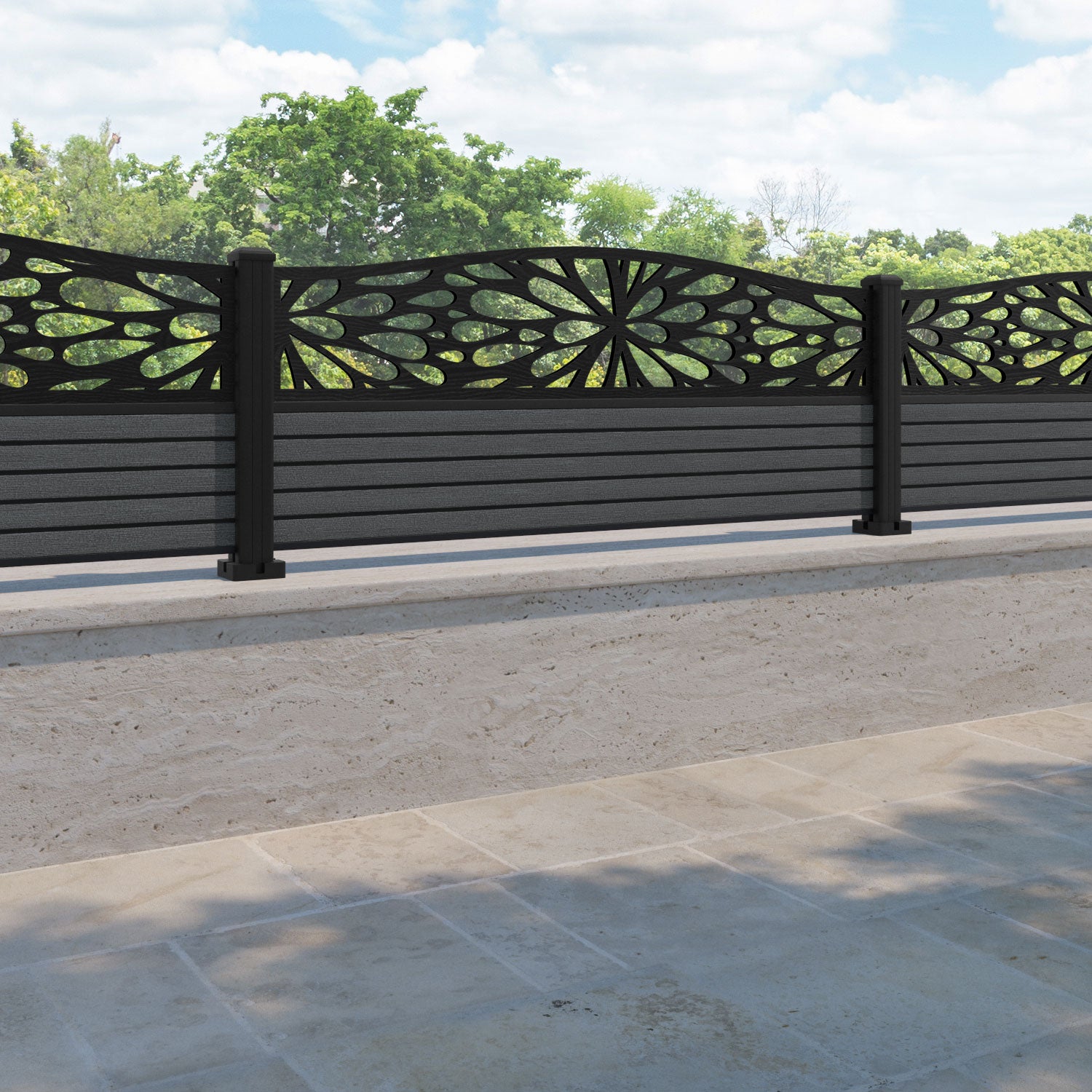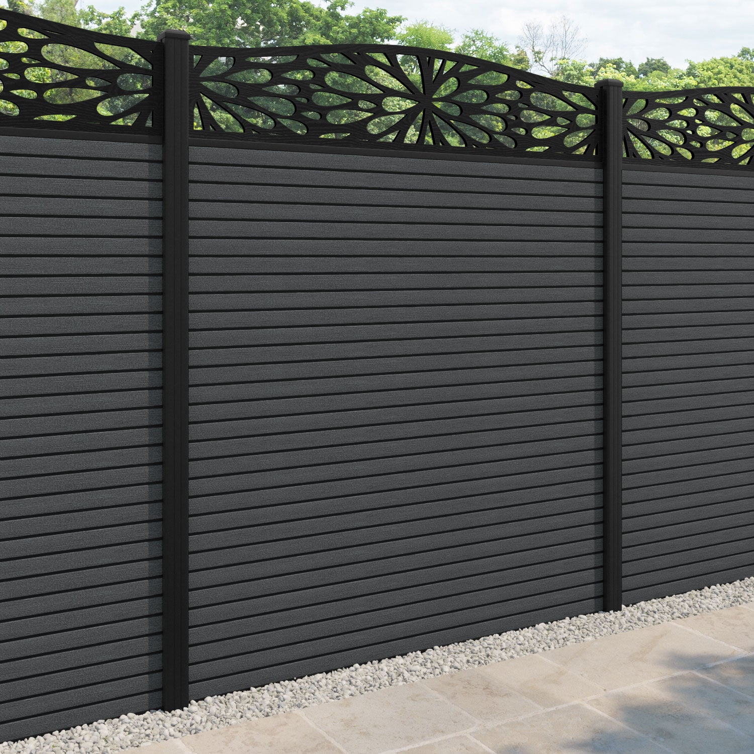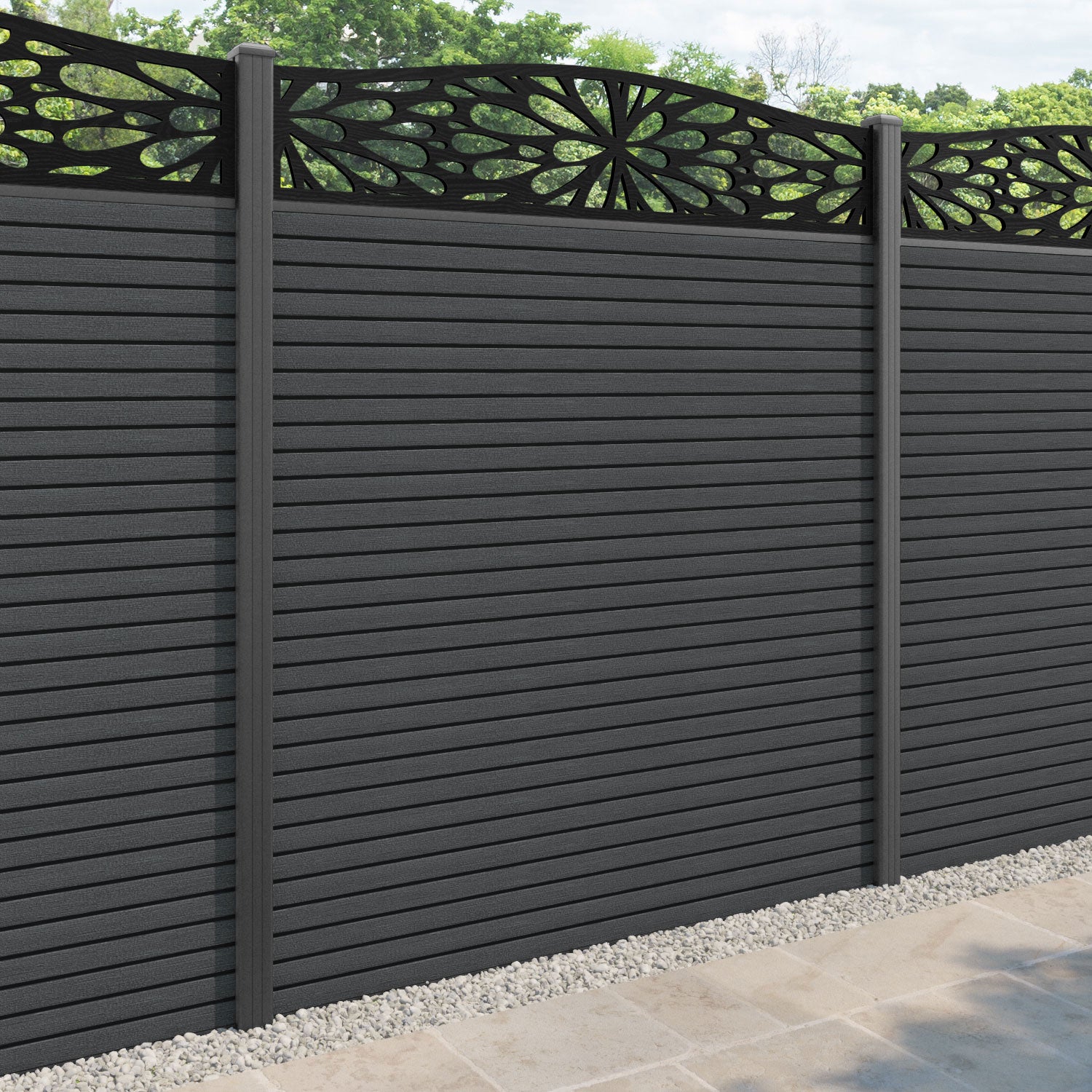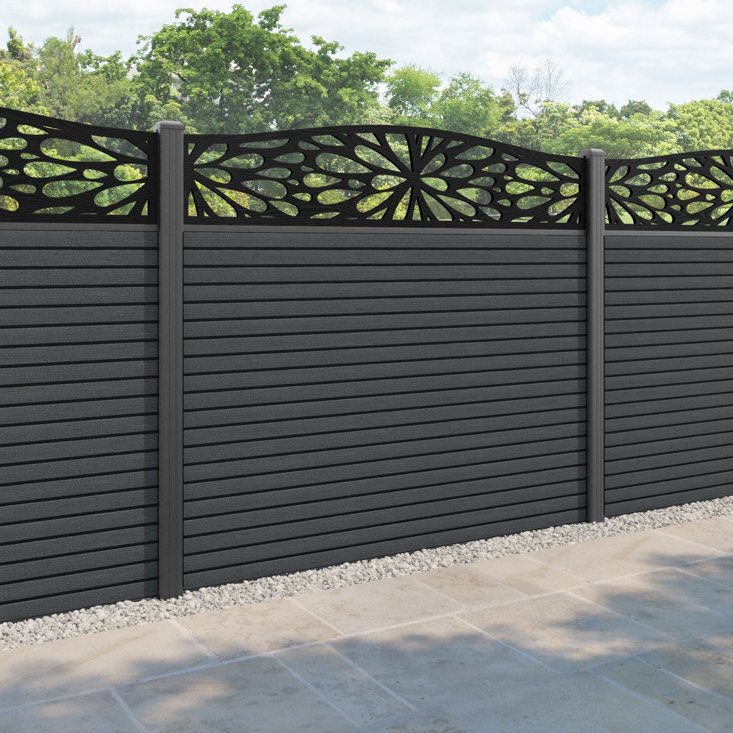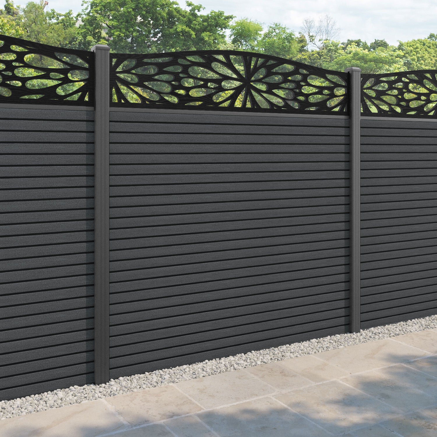 Hudson Blossom Curved Top Fence Panel Dark Grey - with our aluminium posts