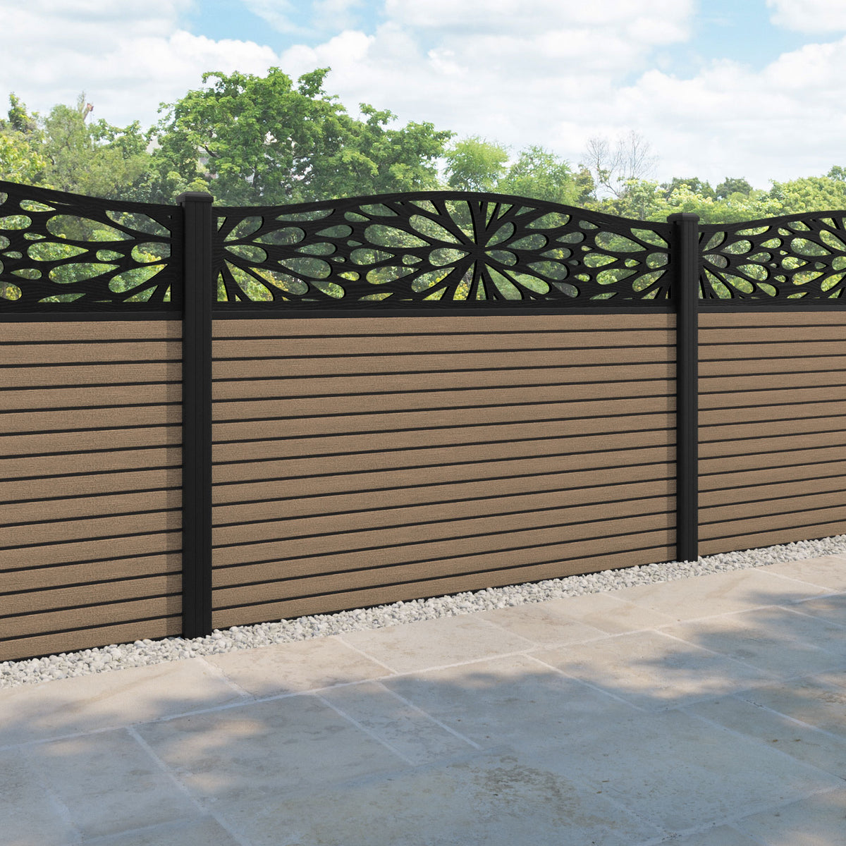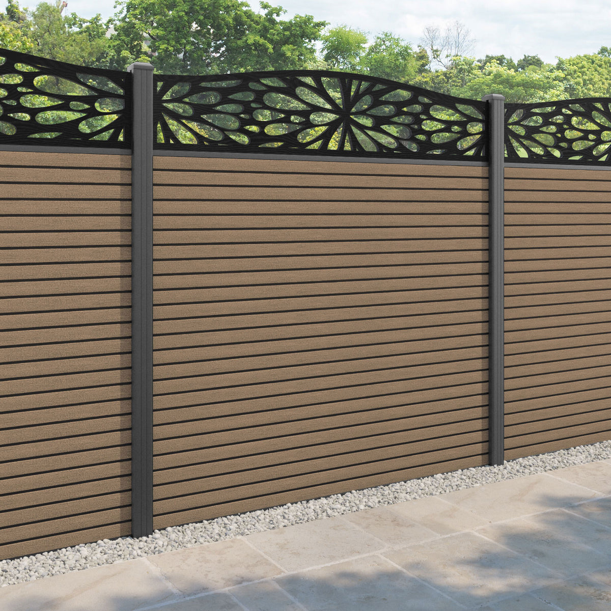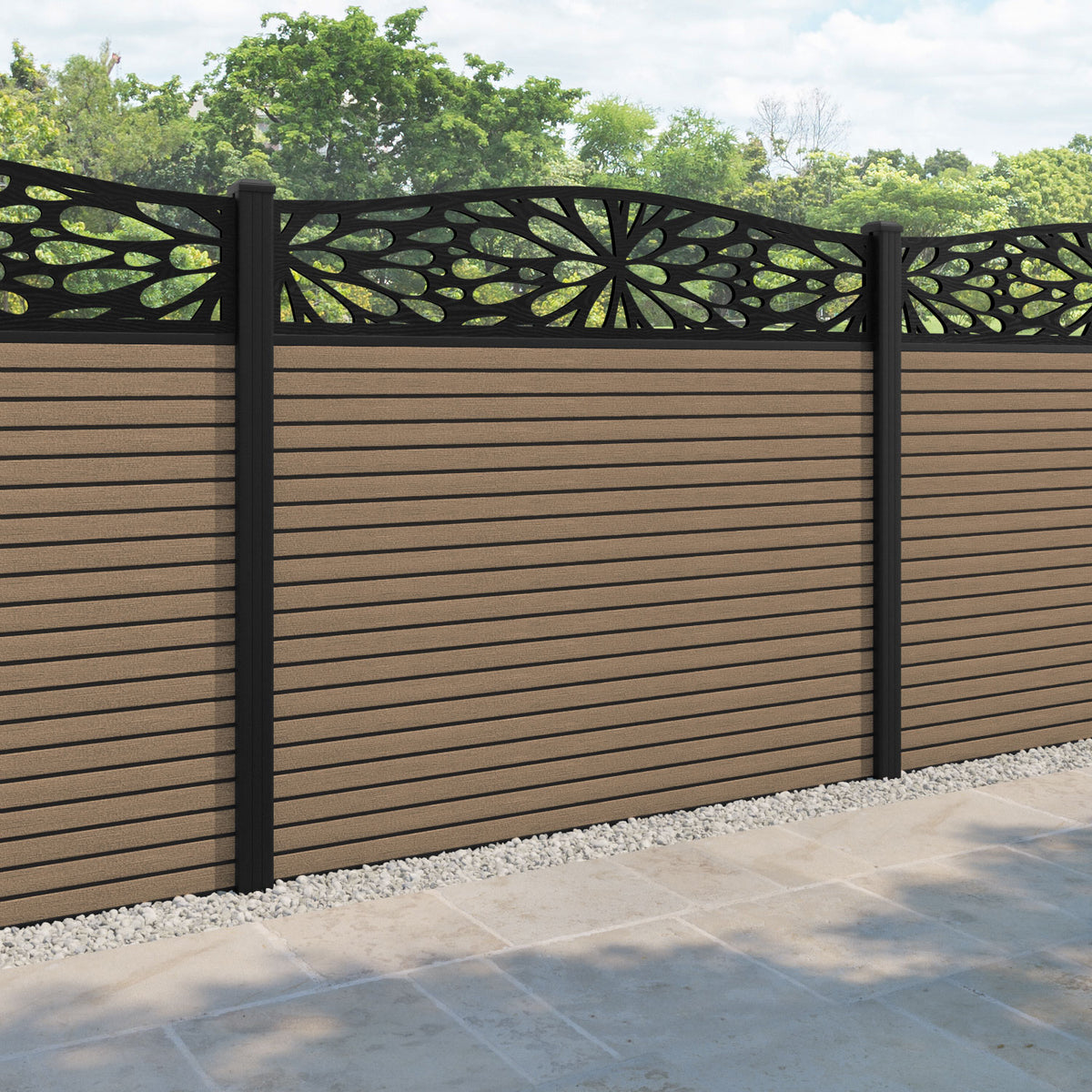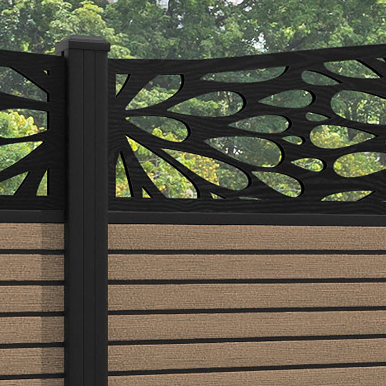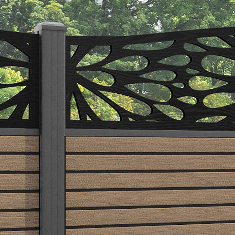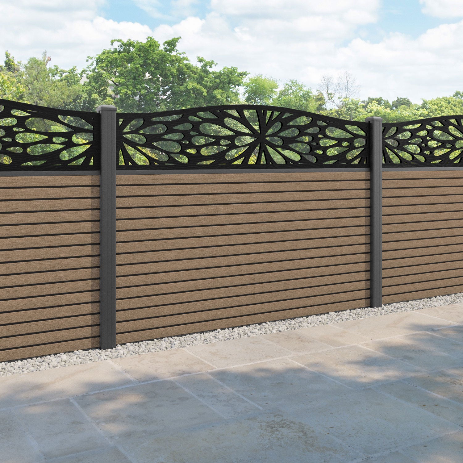 Hudson Blossom Curved Top Fence Panel Teak - with our aluminium posts