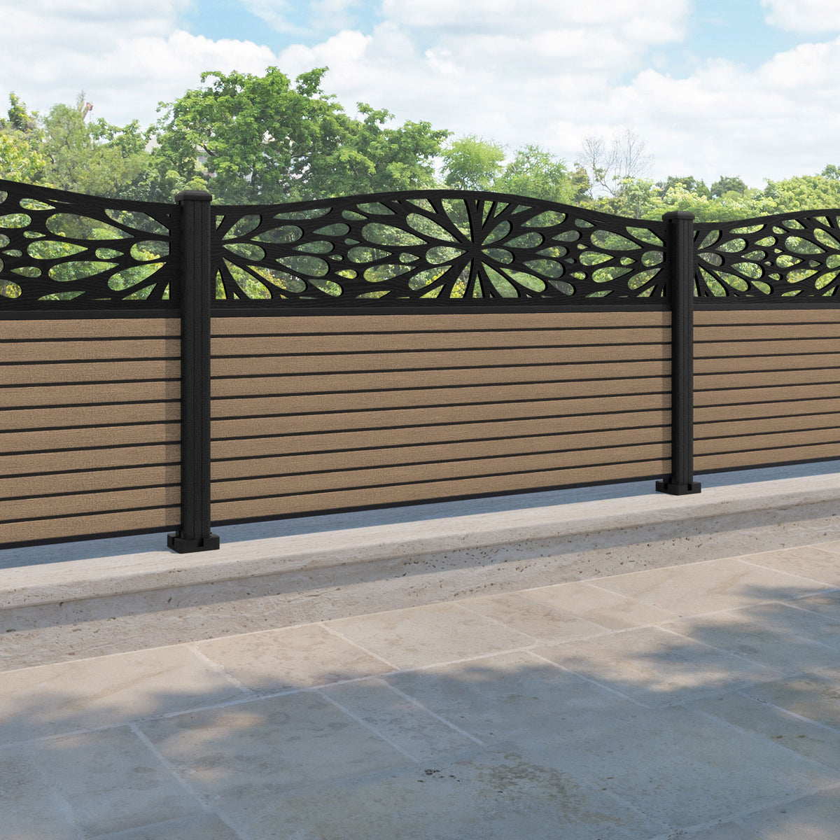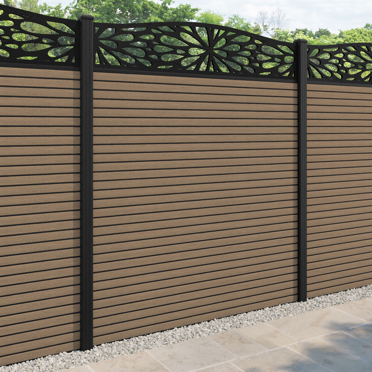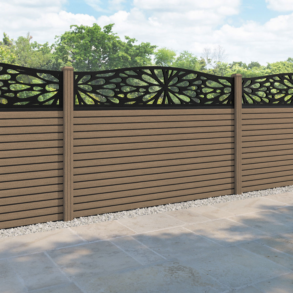 Hudson Blossom Curved Top Fence Panel Teak - with our composite posts
