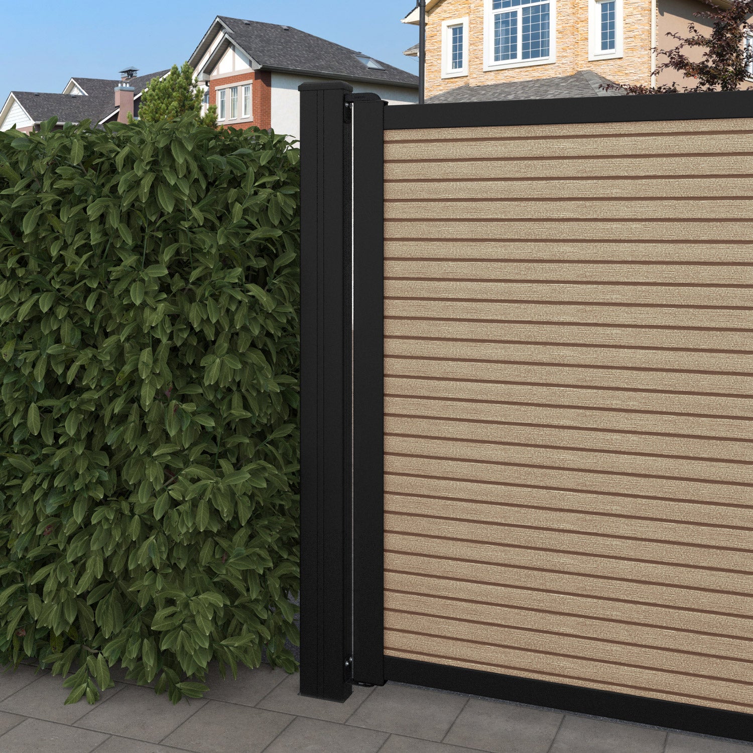 Pair your gate with our eco-friendly composite or aluminium slats for a seamless match with our fencing collections, ensuring a stylish and cohesive look.