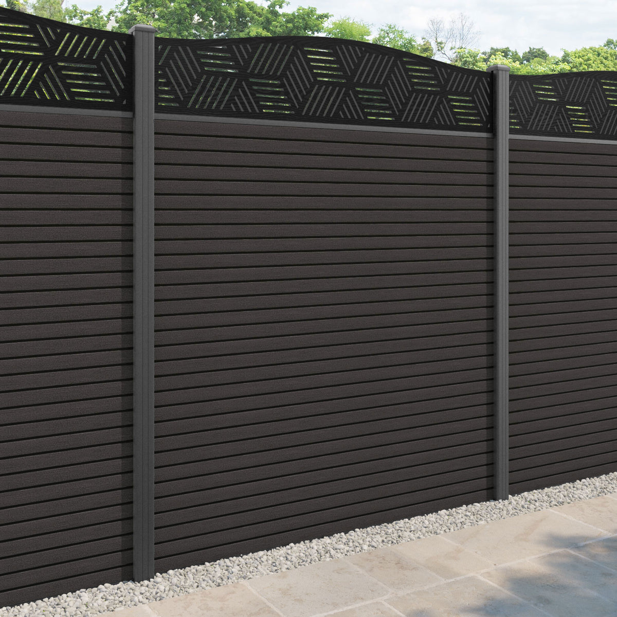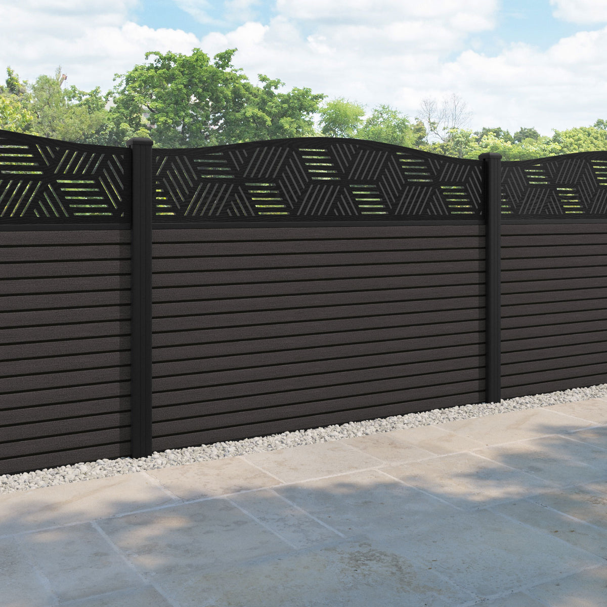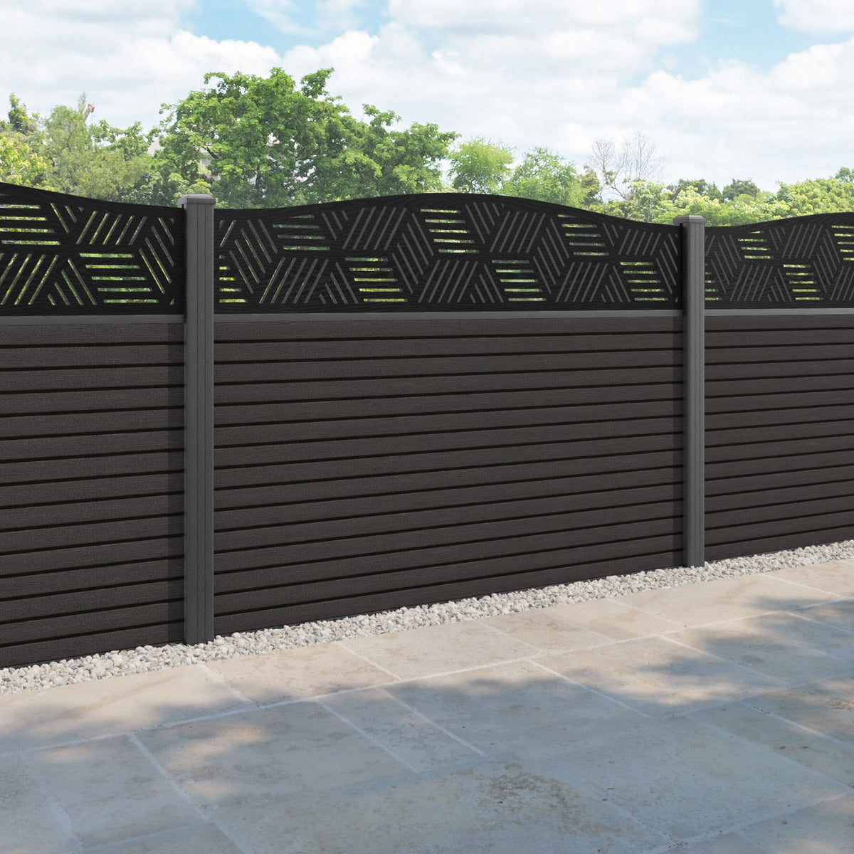 Hudson Cubed Curved Top Fence Panel Dark Oak - with our aluminium posts