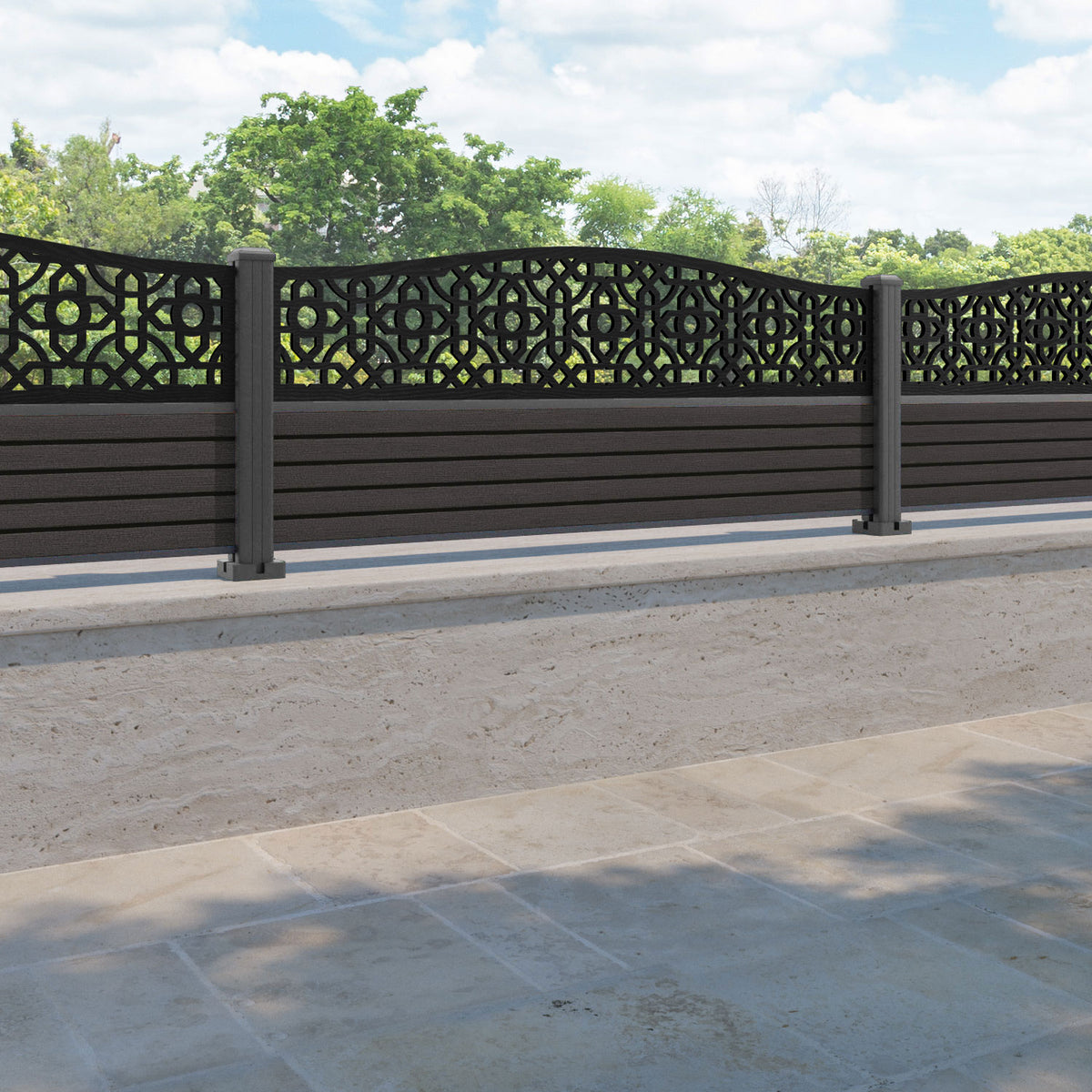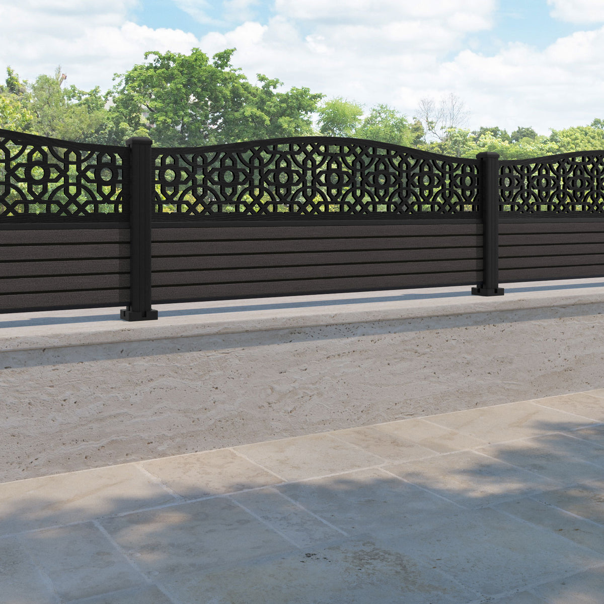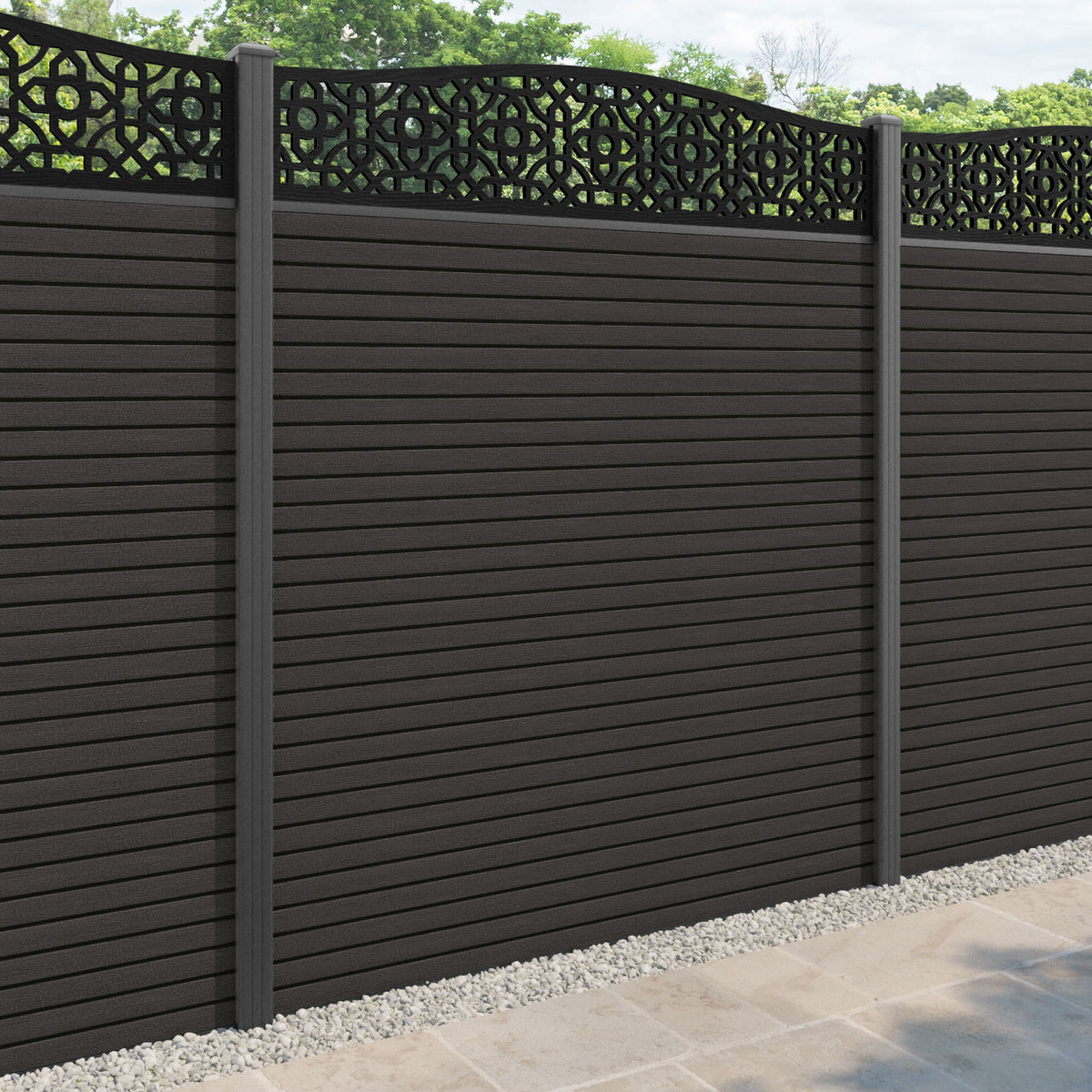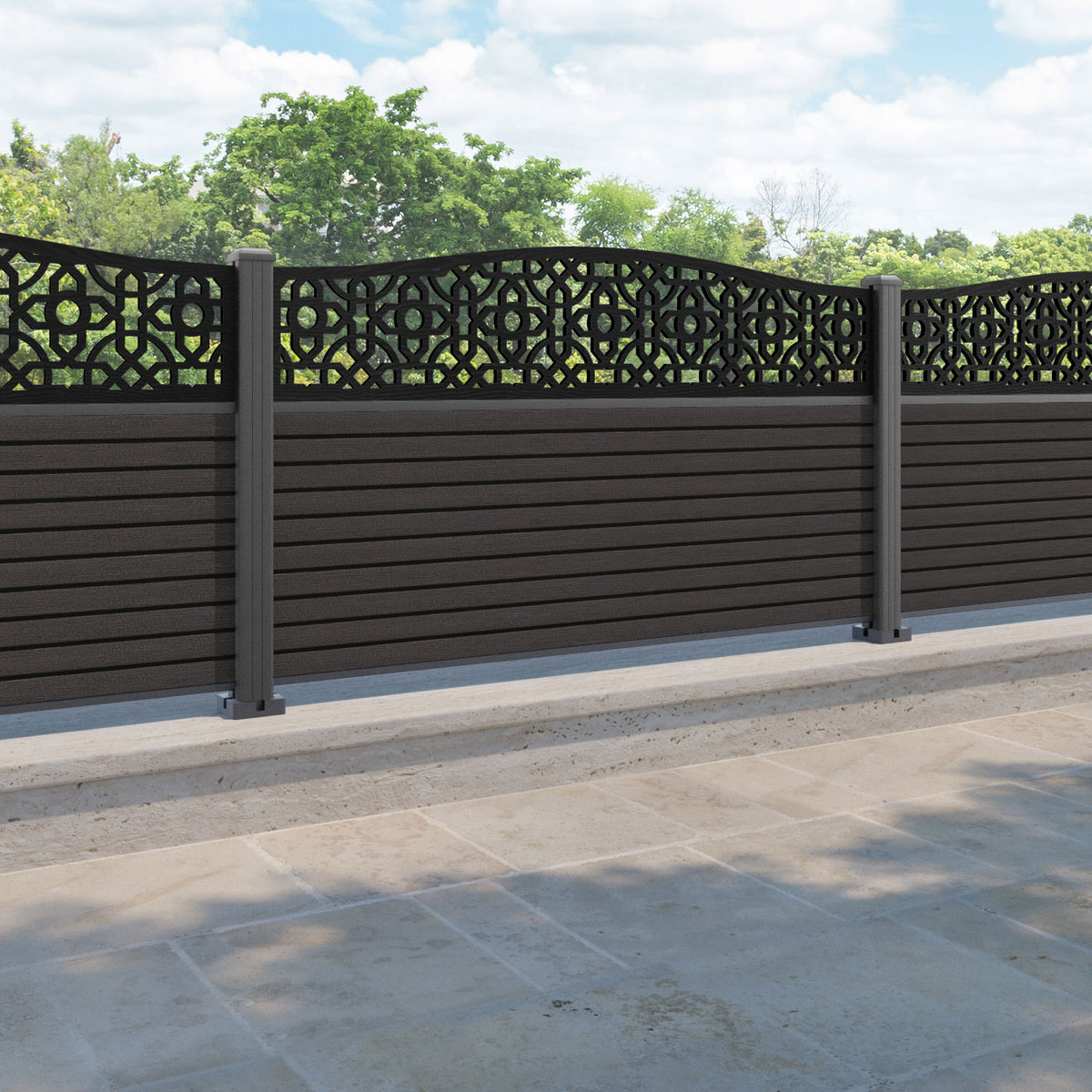 Hudson Nabila Curved Top Fence Panel Dark Oak - with our aluminium posts