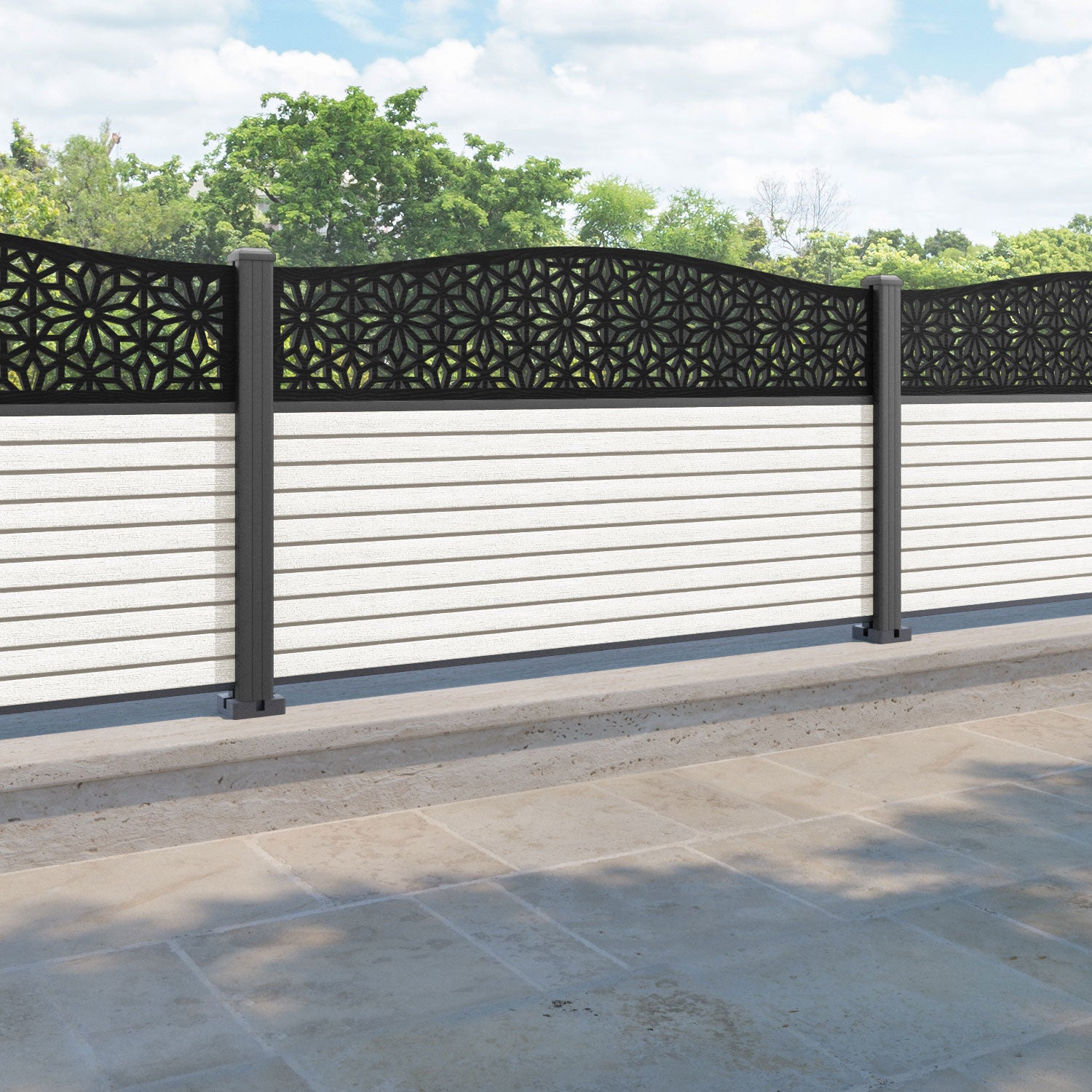 Hudson Narwa Curved Top Fence Panel Light Stone - with our aluminium posts