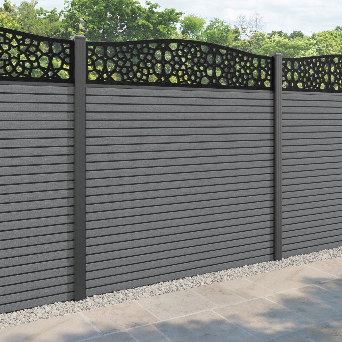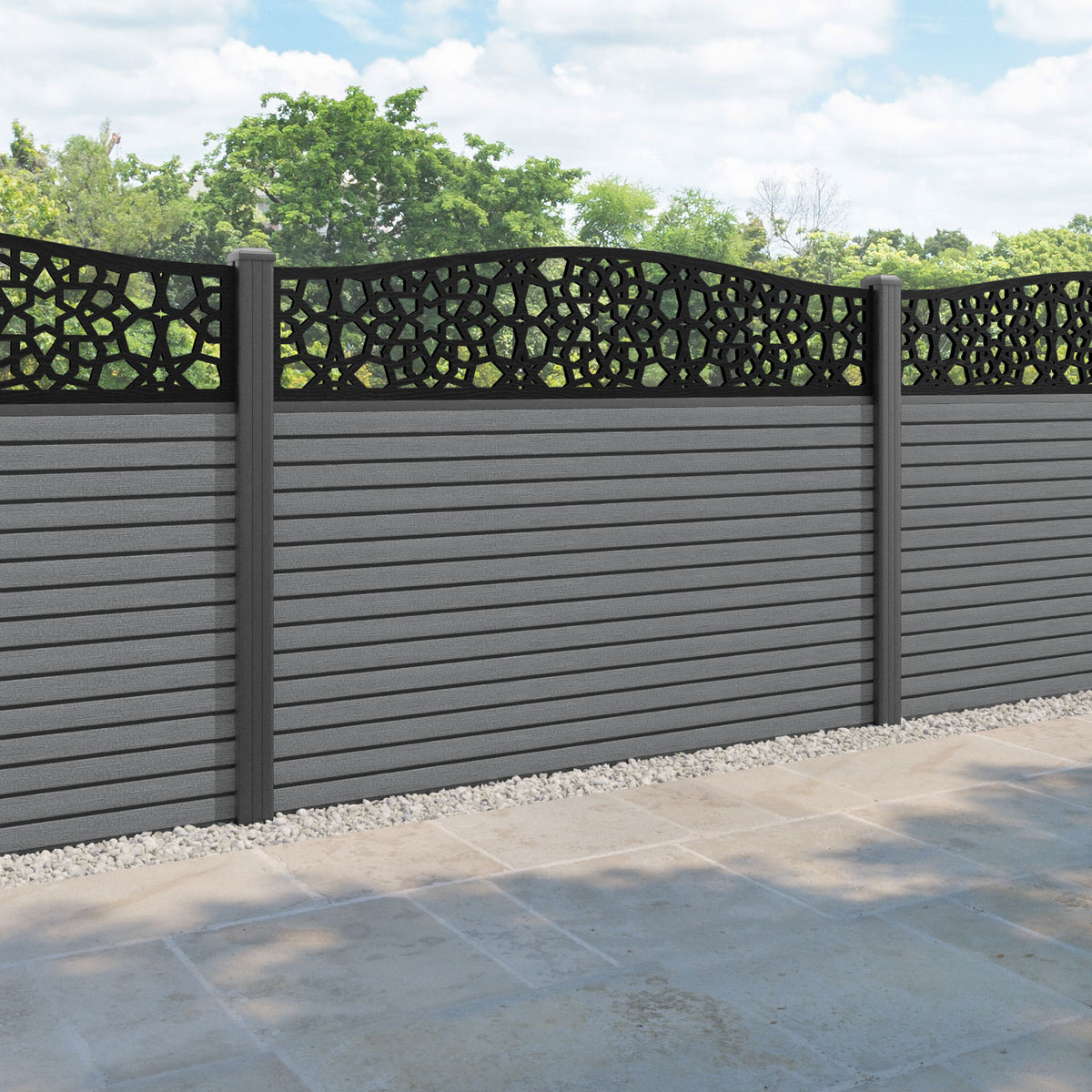 Hudson Nazira Curved Top Fence Panel Mid Grey - with our aluminium posts