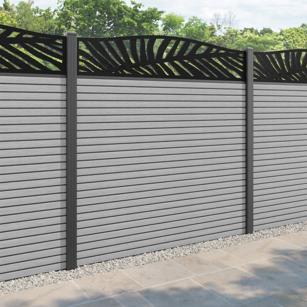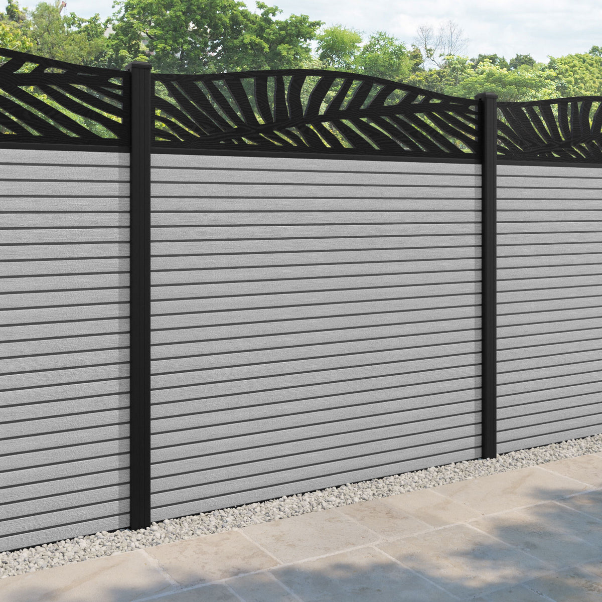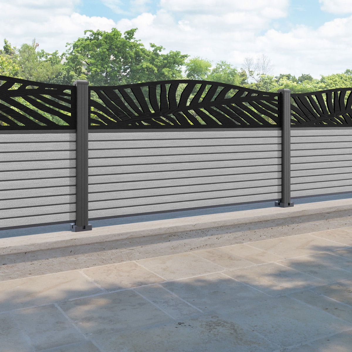 Hudson Palm Curved Top Fence Panel Light Grey - with our aluminium posts