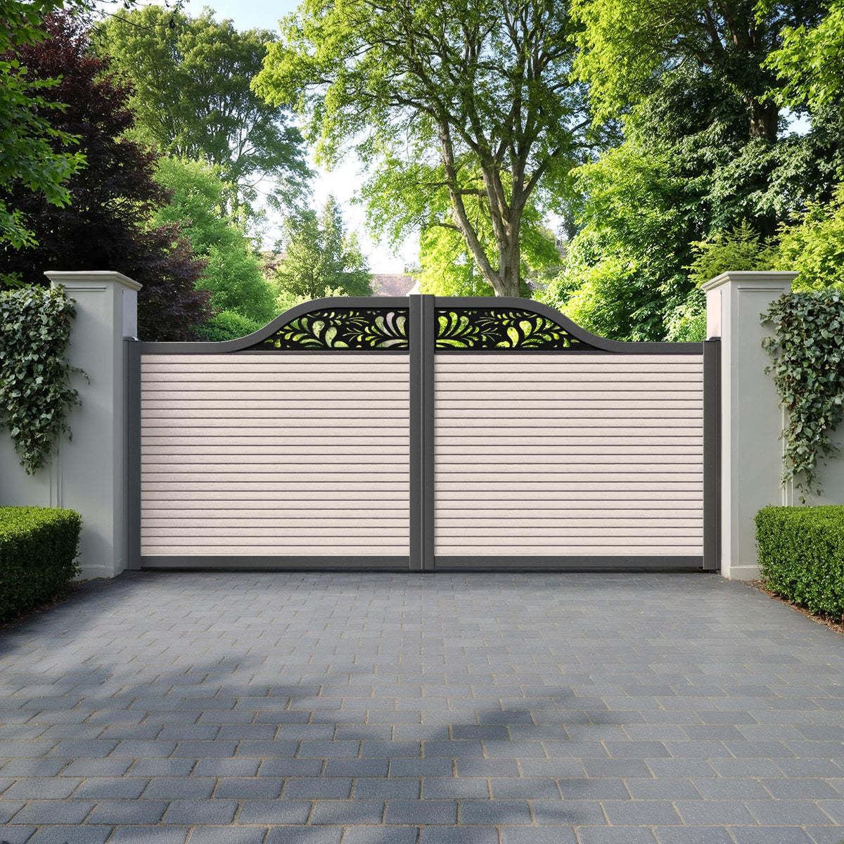 Hudson Petal Curved Top Driveway Gate Mid Stone - Top Screen