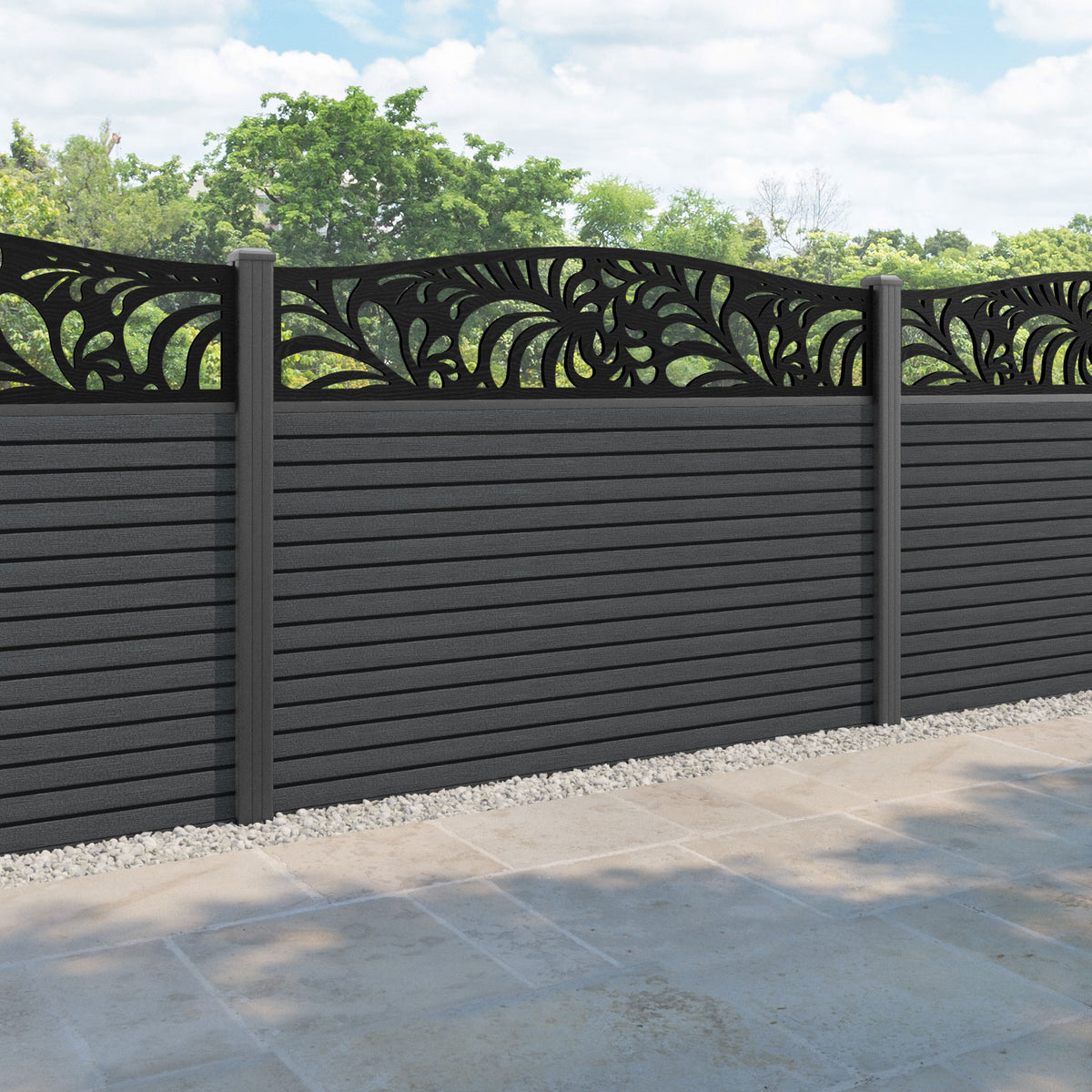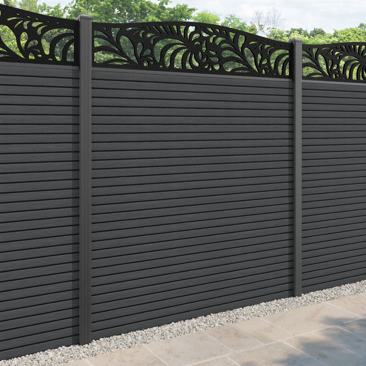 Hudson Petal Curved Top Fence Panel Dark Grey - with our aluminium posts