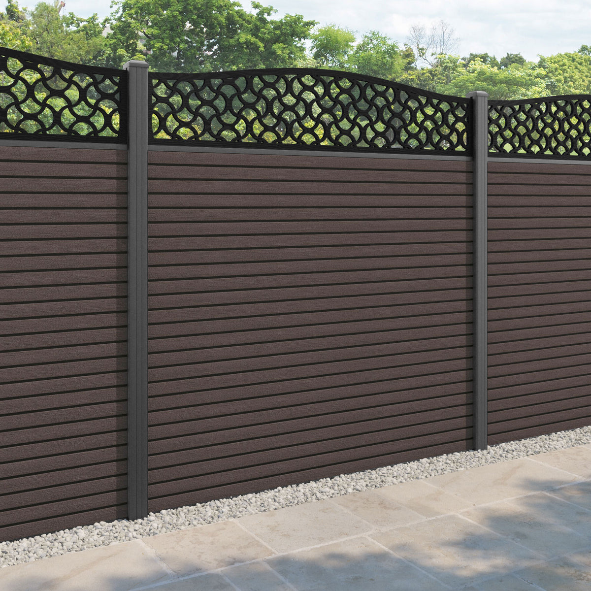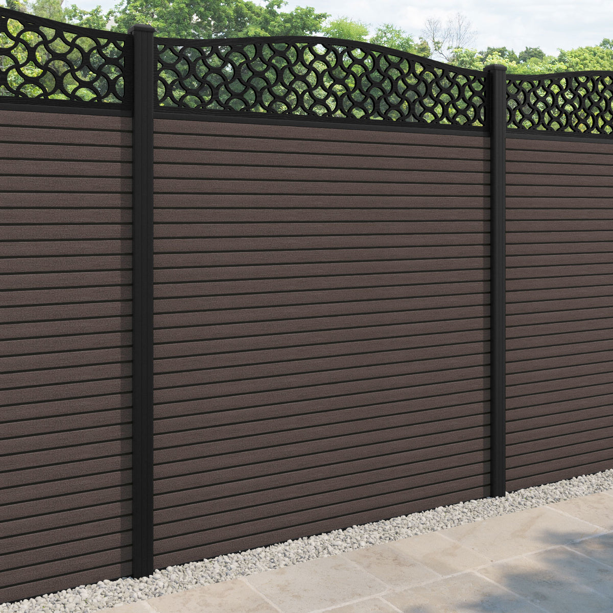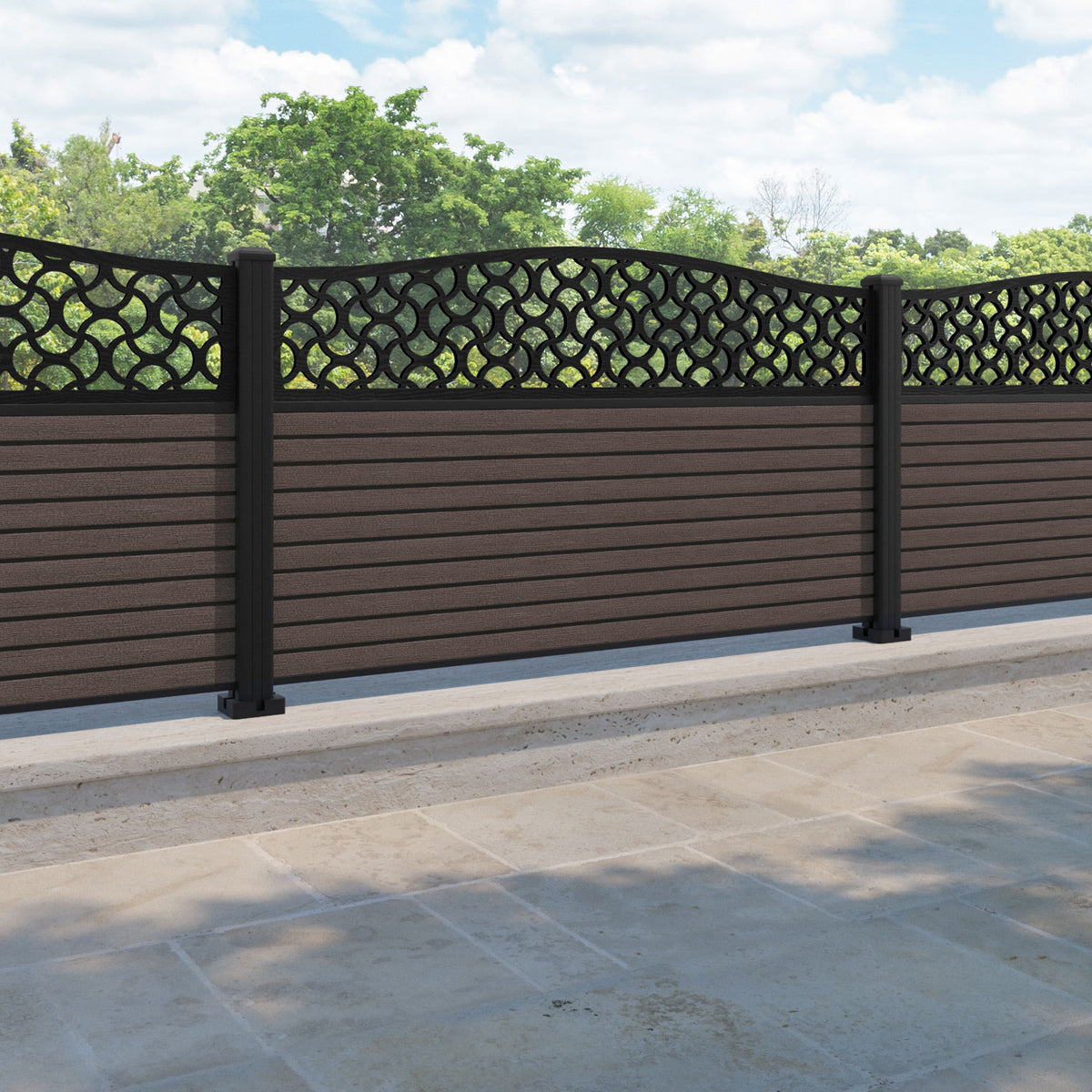 Hudson Vida Curved Top Fence Panel Mid Brown - with our aluminium posts