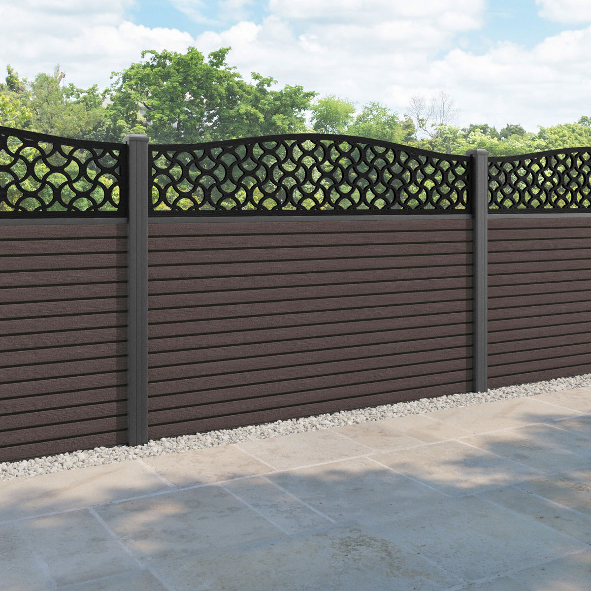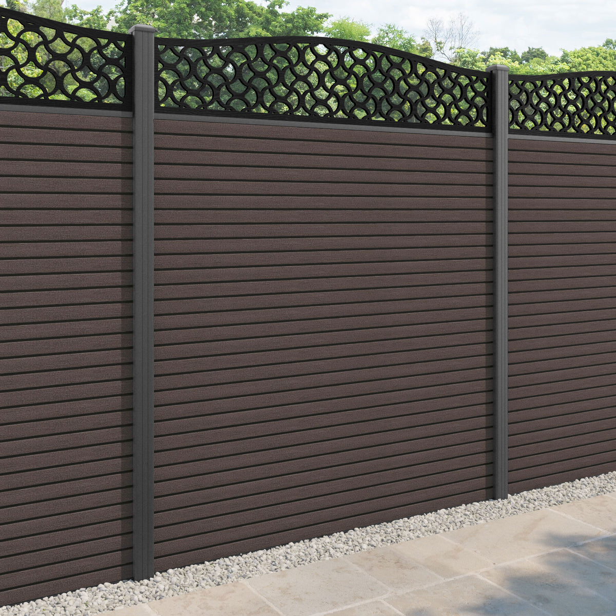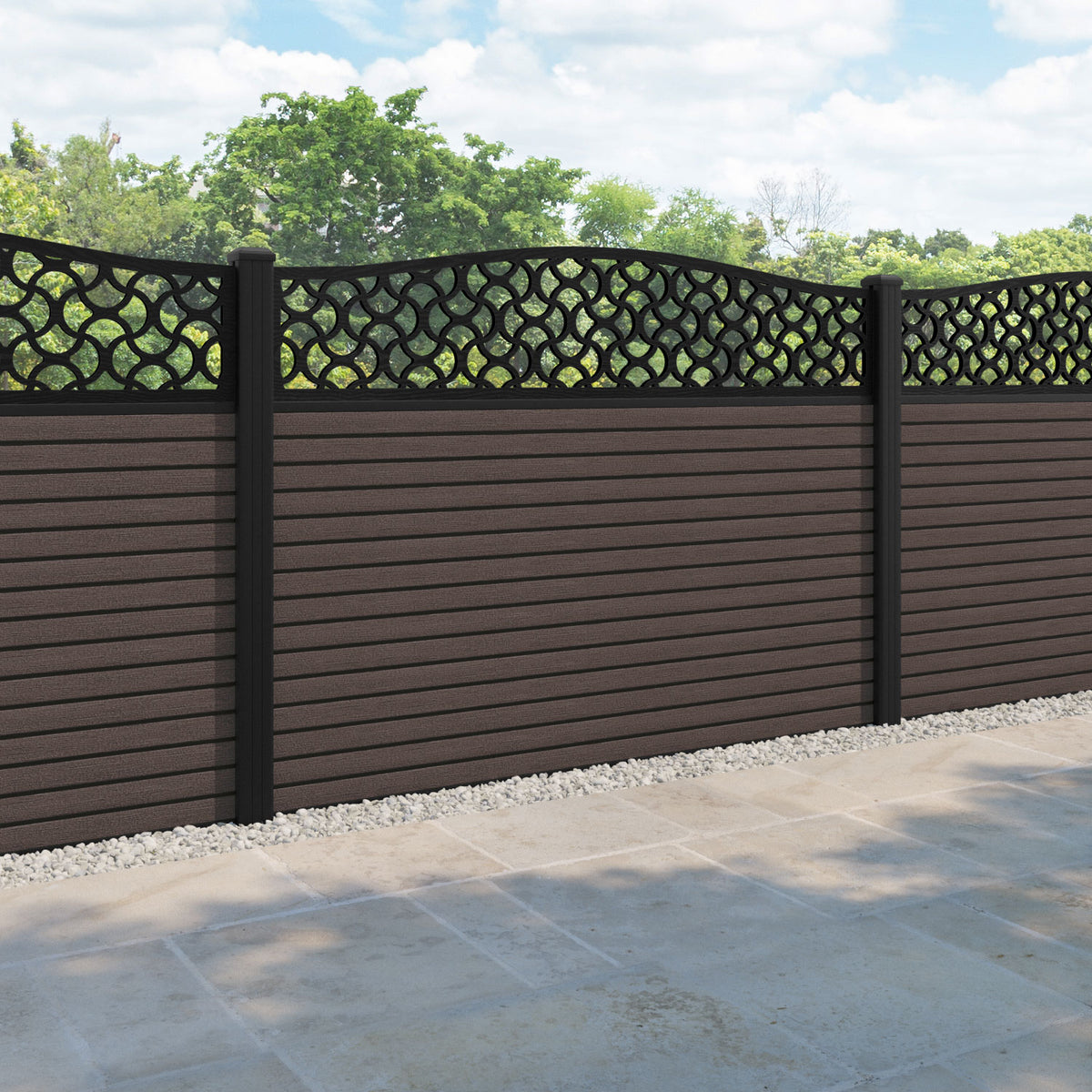 Hudson Vida Curved Top Fence Panel Mid Brown - with our aluminium posts