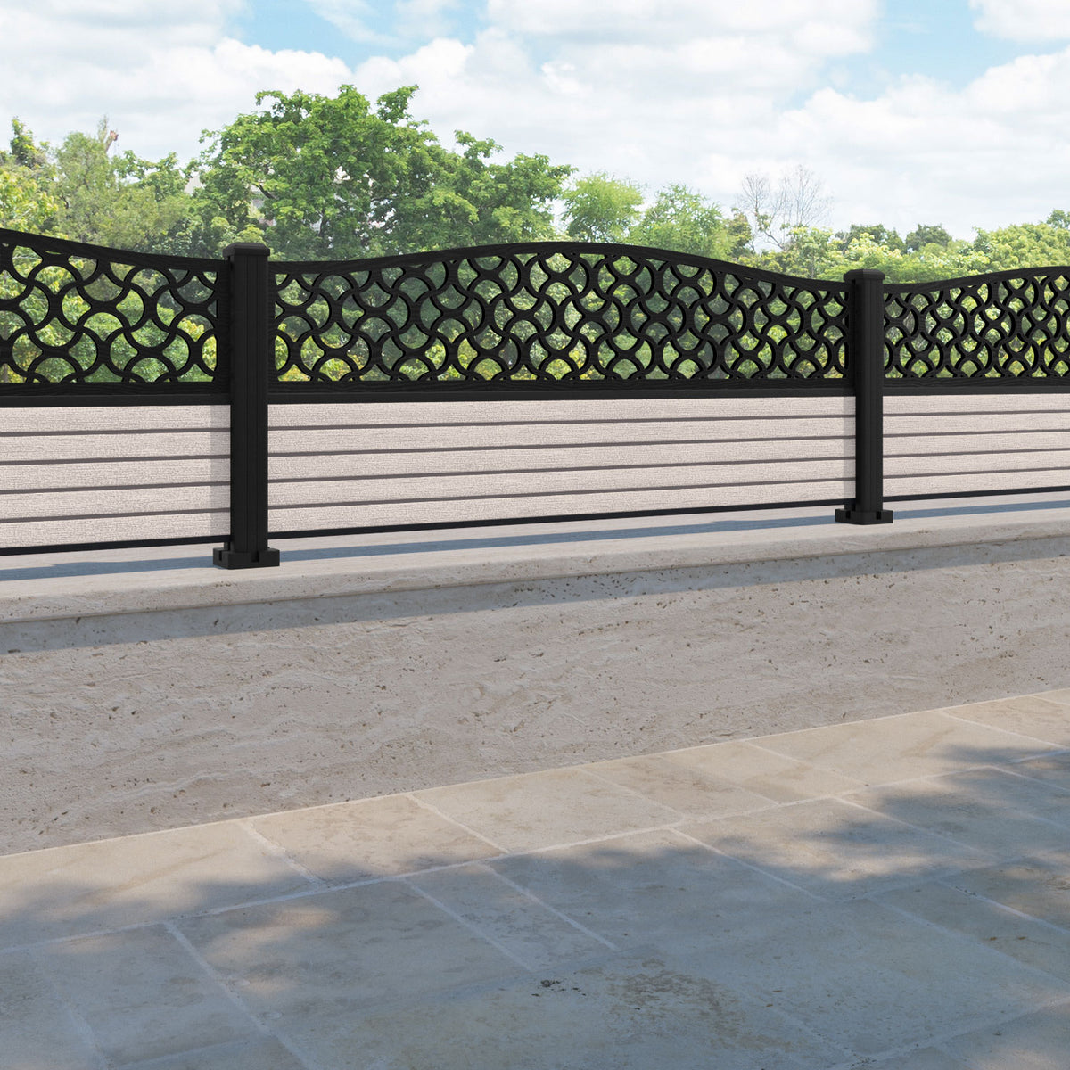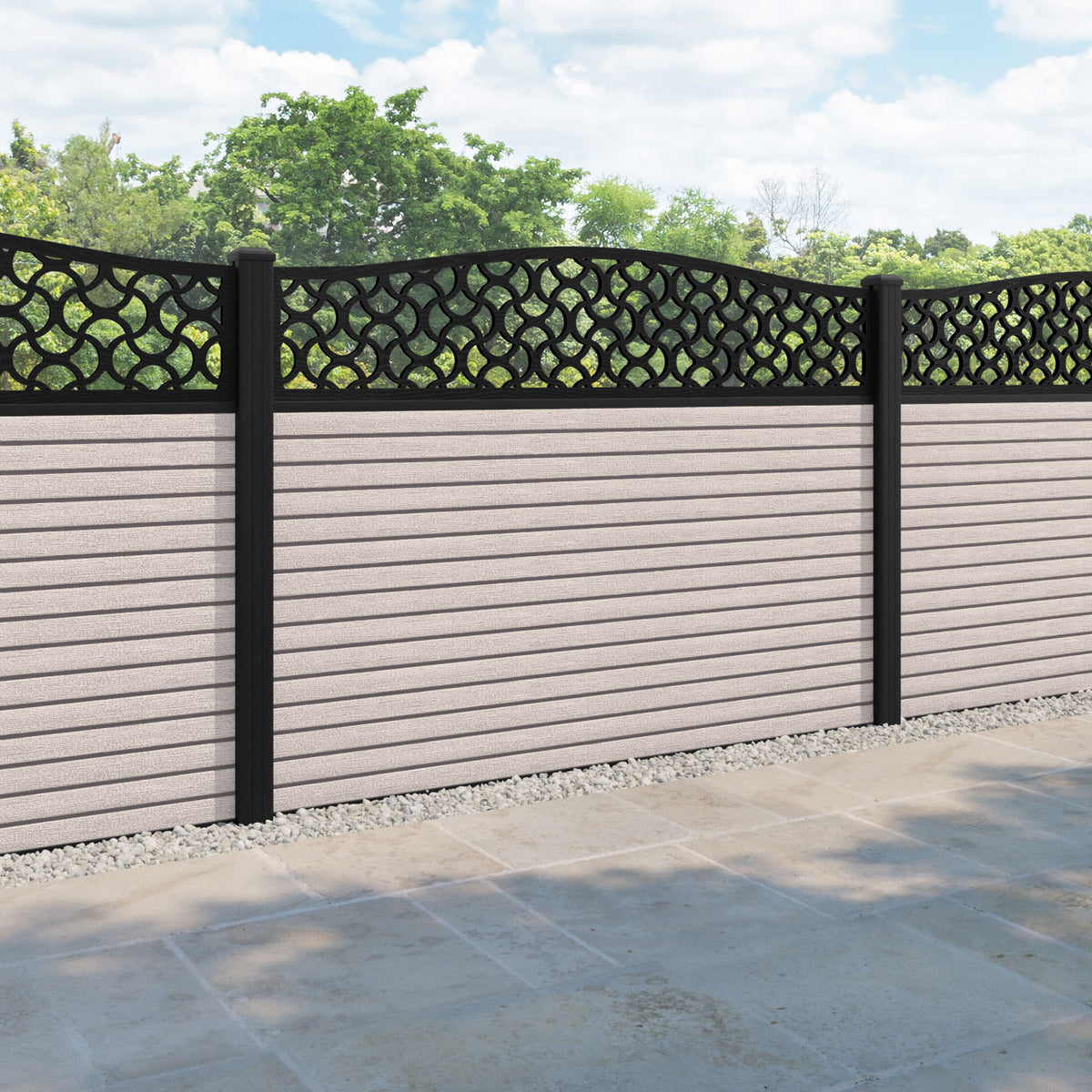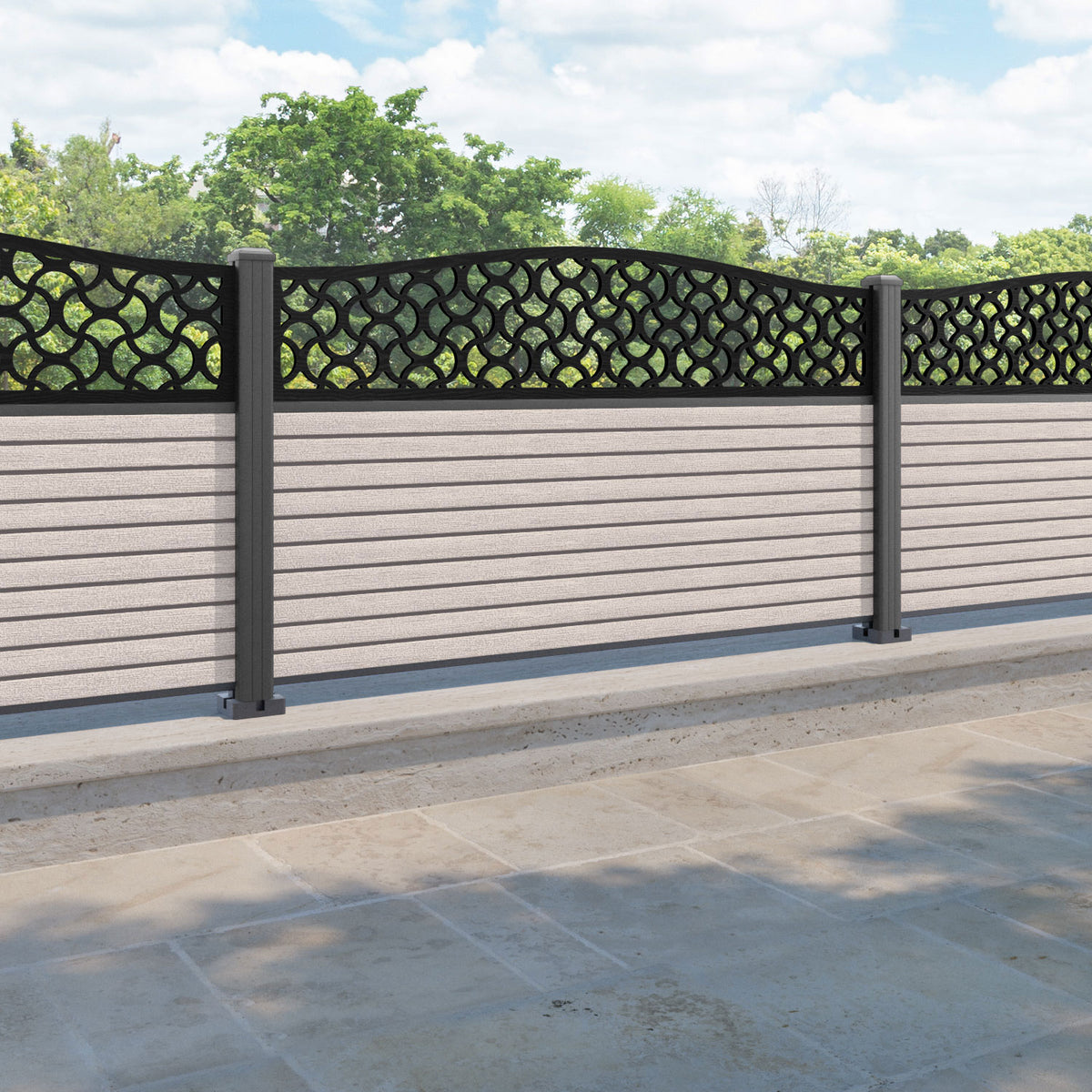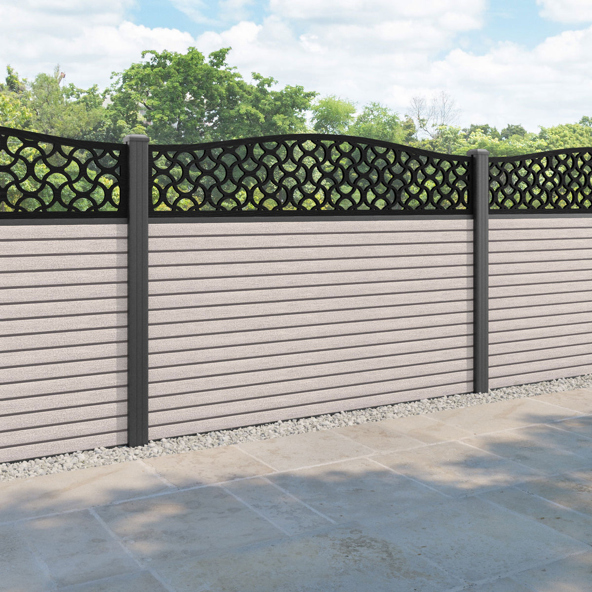 Hudson Vida Curved Top Fence Panel Mid Stone - with our aluminium posts
