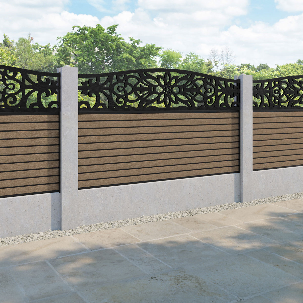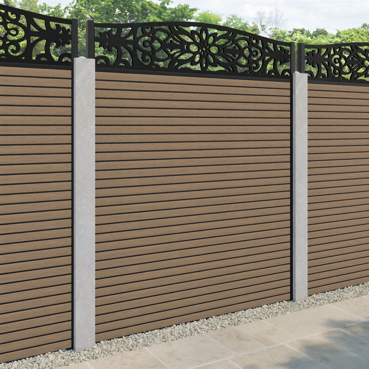 Our Windsor premium composite fence screens, 18mm thick teak fence slats and high-grade composite channels are the perfect choice if you have existing concrete posts. Create an elegant, versatile, and eco-friendly fencing solution. Not only is this fencing responsibly sourced, it is also durable, long-lasting and requires no maintenance or painting.