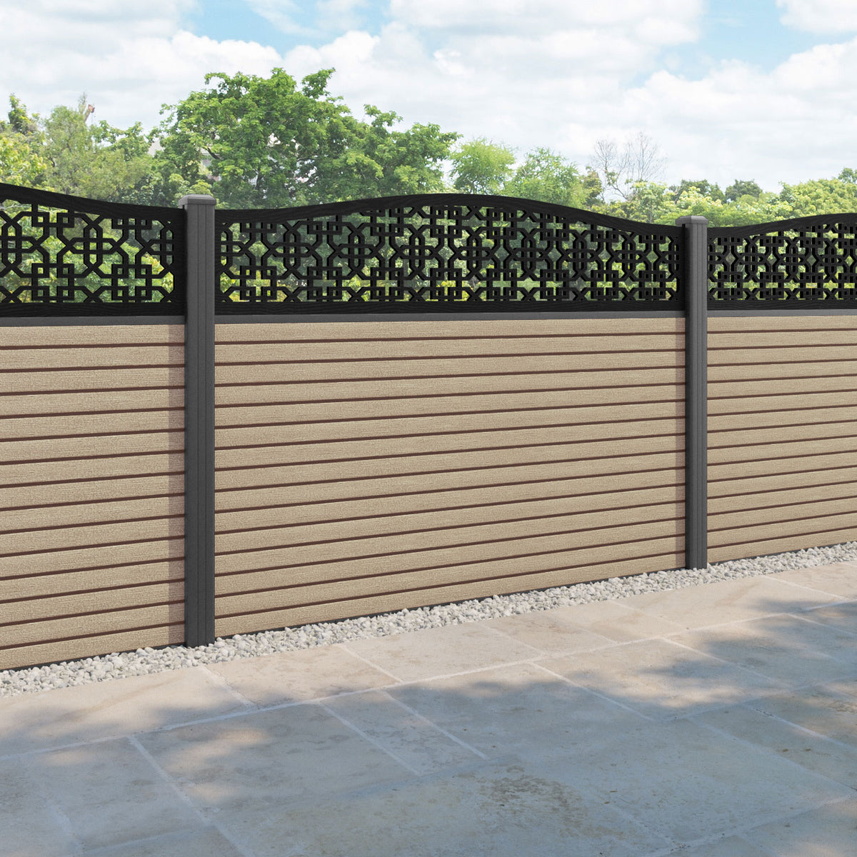 Hudson Zaria Curved Top Fence Panel Light Oak - with our aluminium posts