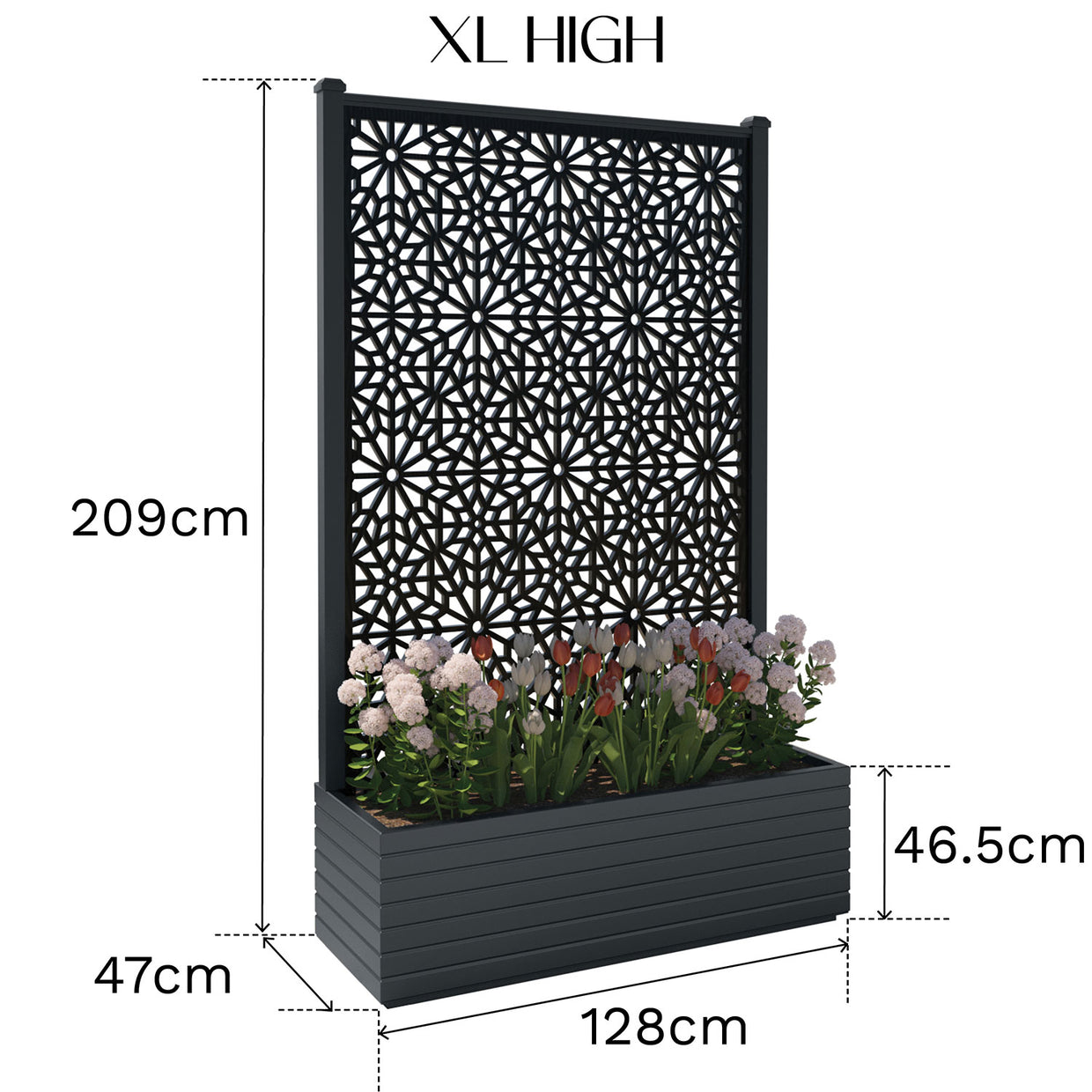 The planters are available in 6 different sizes and can be paired with any of our decorative screens that are available in 5 different colour options. The screens can be fixed at the back or in the centre of the planter. The centre option enables you to plant on both sides of the screen. They can also be ordered with a wheeled base for convenience, with lockable wheels for stability.