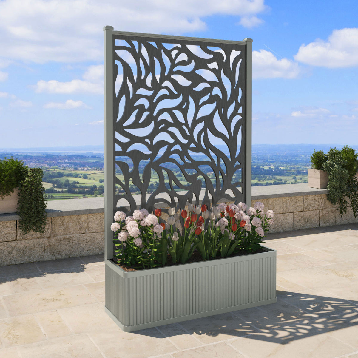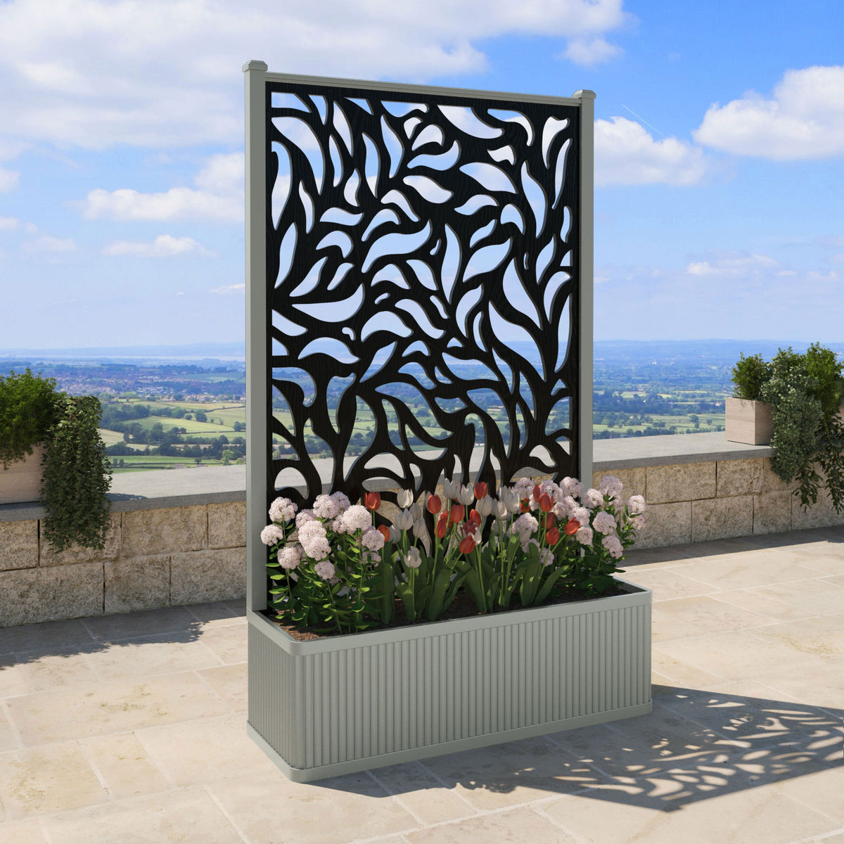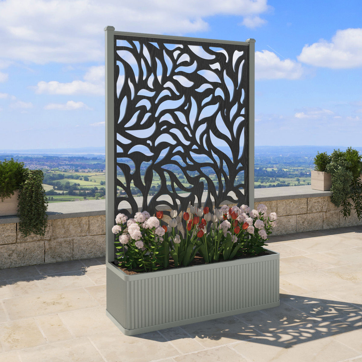 The planters are available in 6 different sizes and can be paired with any of our decorative screens that are available in 5 different colour options. The screens can be fixed at the back or in the centre of the planter. The centre option enables you to plant on both sides of the screen. They can also be ordered with a wheeled base for convenience, with lockable wheels for stability.