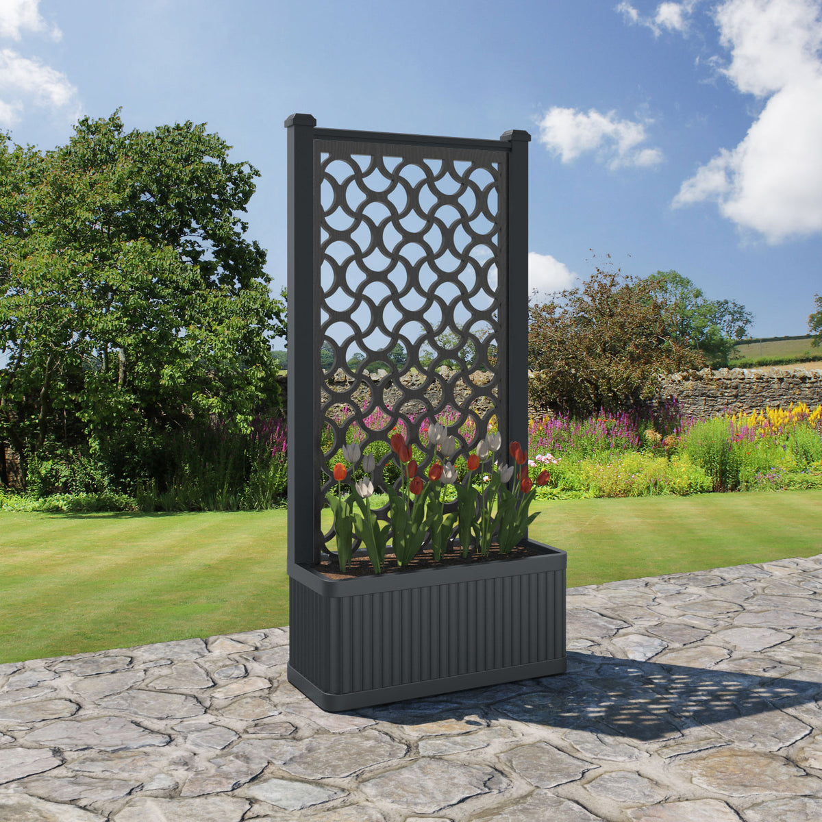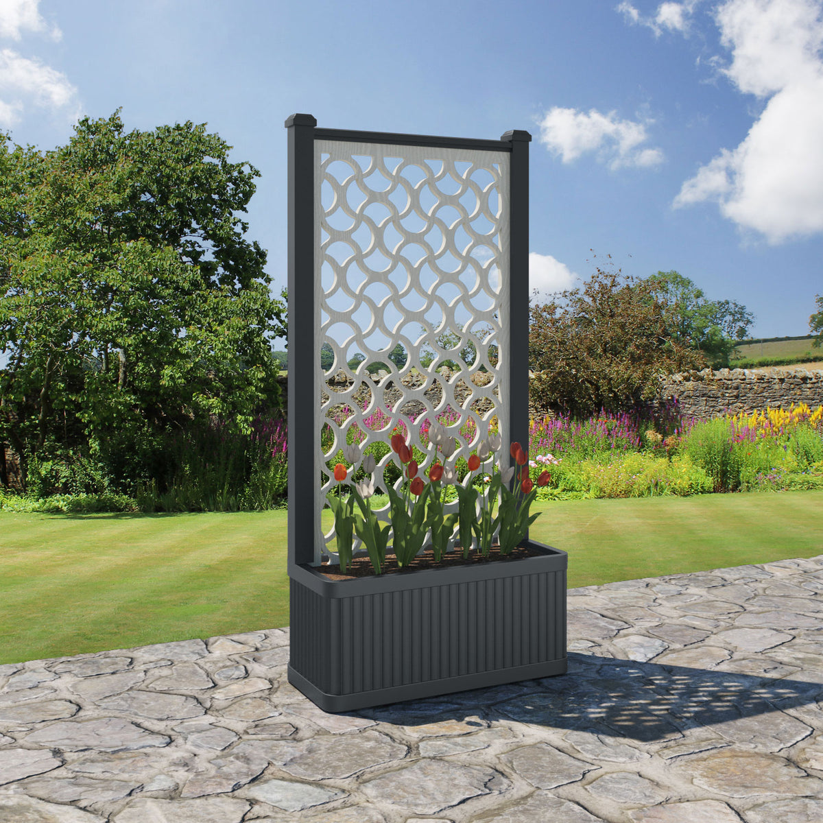 The planters are available in 6 different sizes and can be paired with any of our decorative screens that are available in 5 different colour options. The screens can be fixed at the back or in the centre of the planter. The centre option enables you to plant on both sides of the screen. They can also be ordered with a wheeled base for convenience, with lockable wheels for stability.