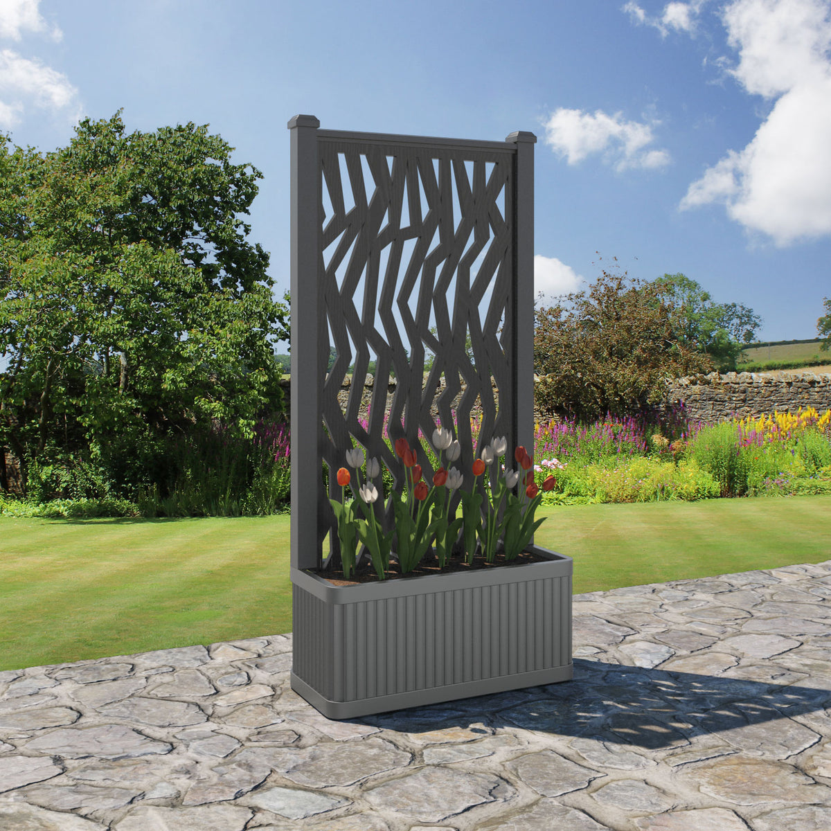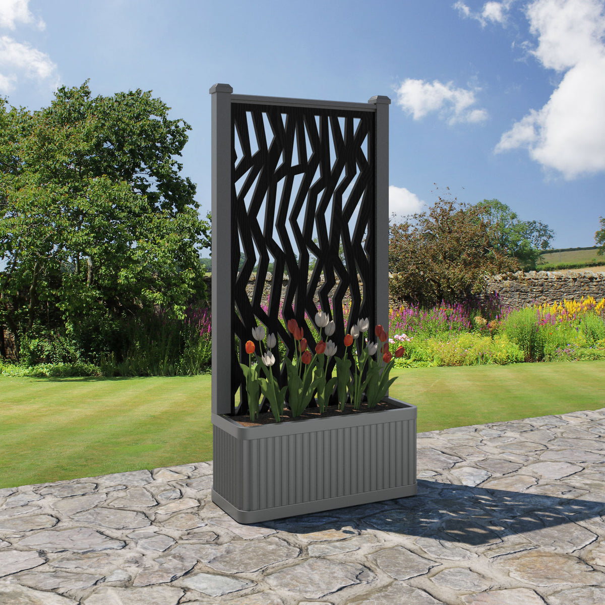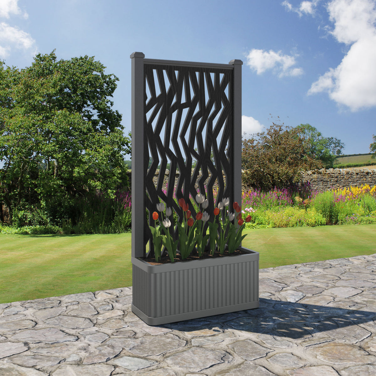The planters are available in 6 different sizes and can be paired with any of our decorative screens that are available in 5 different colour options. The screens can be fixed at the back or in the centre of the planter. The centre option enables you to plant on both sides of the screen. They can also be ordered with a wheeled base for convenience, with lockable wheels for stability.