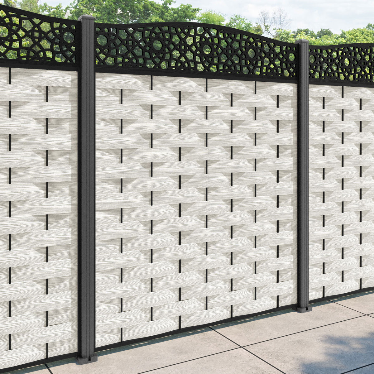 Ripple Ambar Curved Top Fence Panel Light Stone - with our aluminium posts