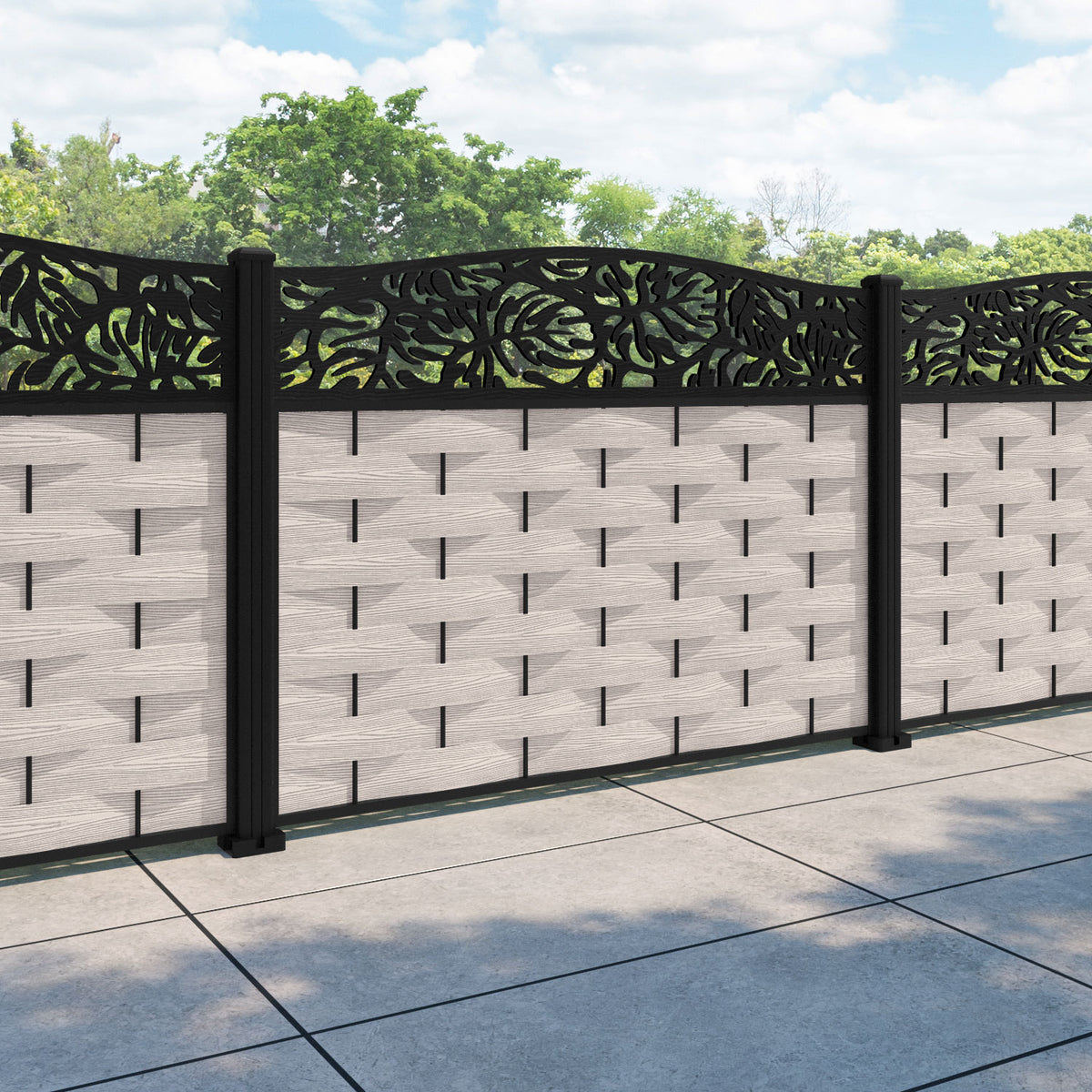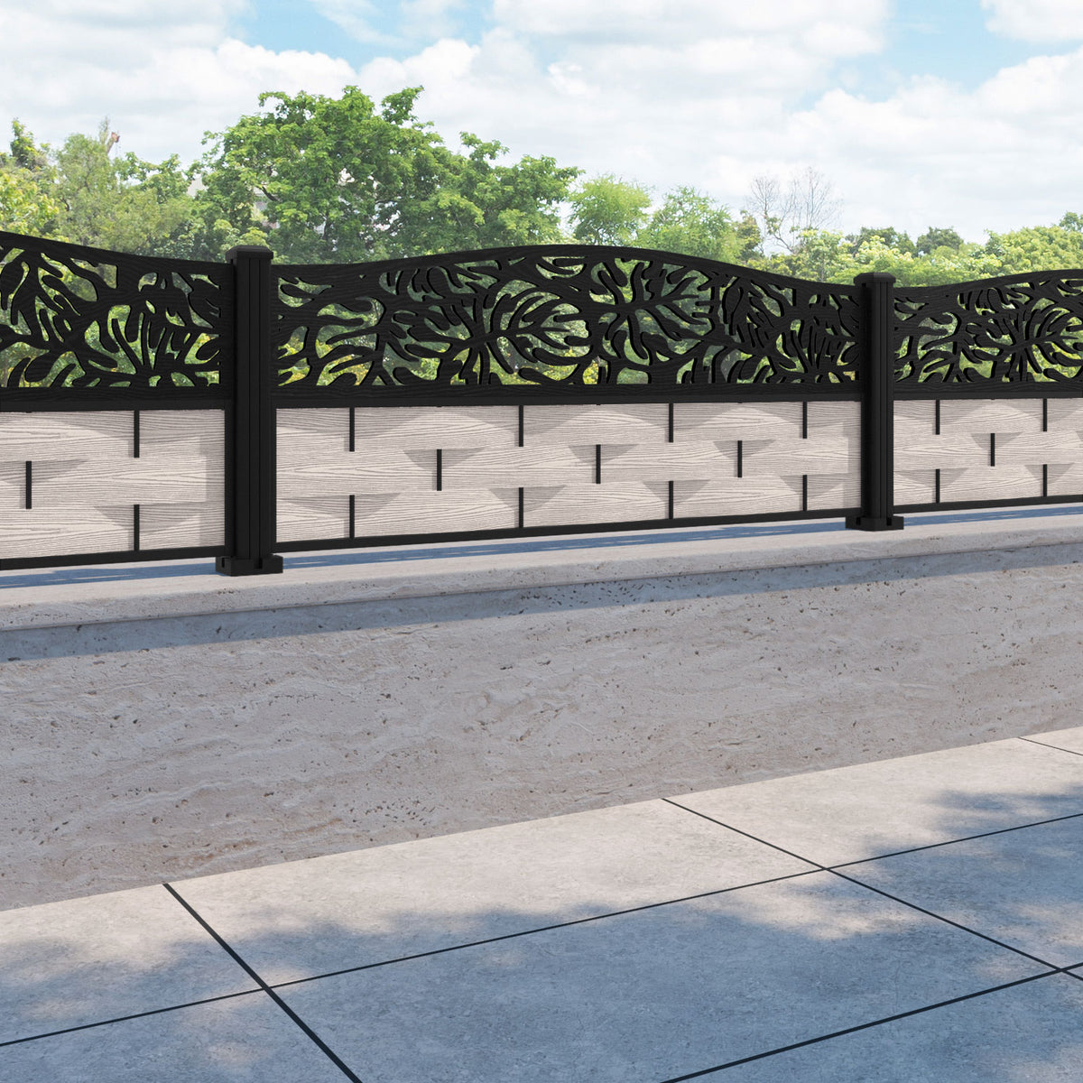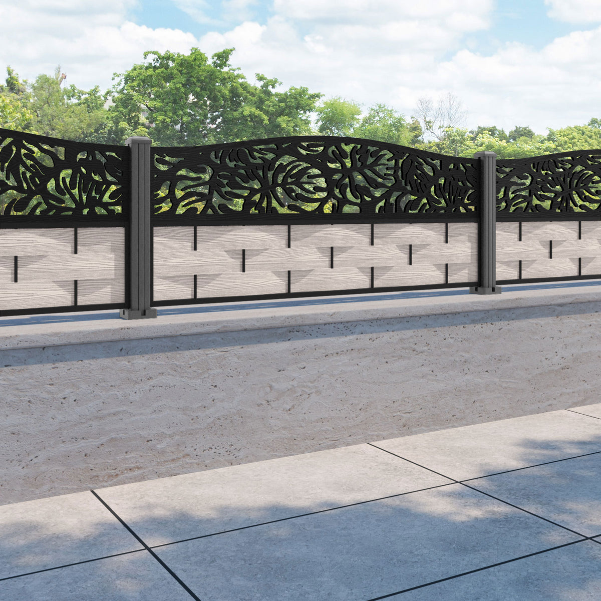 Ripple Botanic Curved Top Fence Panel Mid Stone - with our aluminium posts