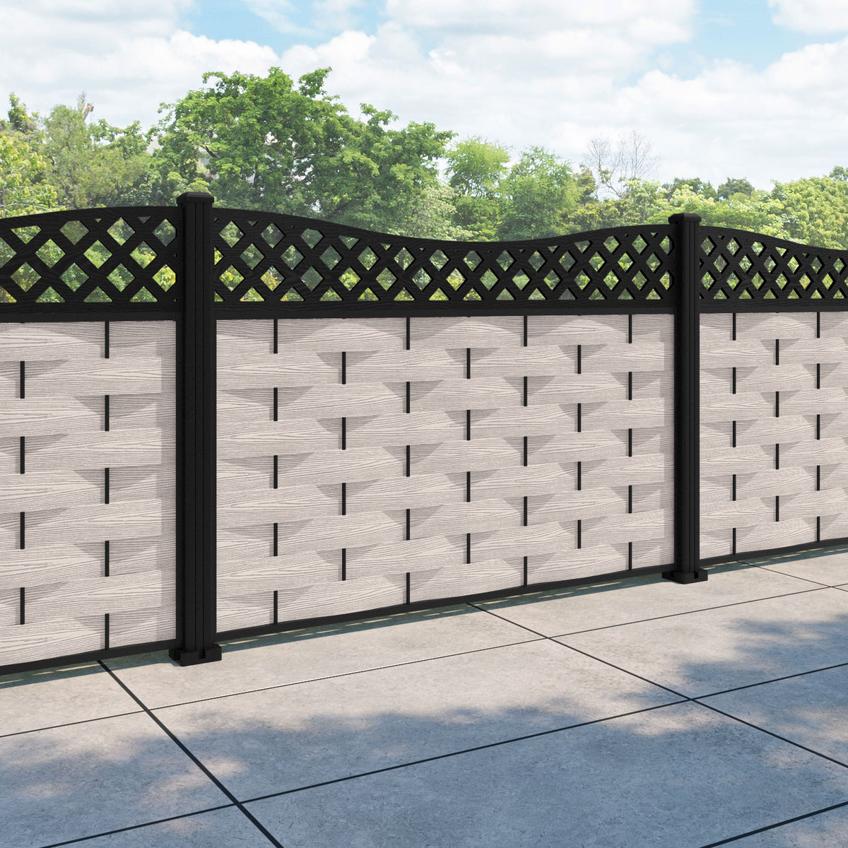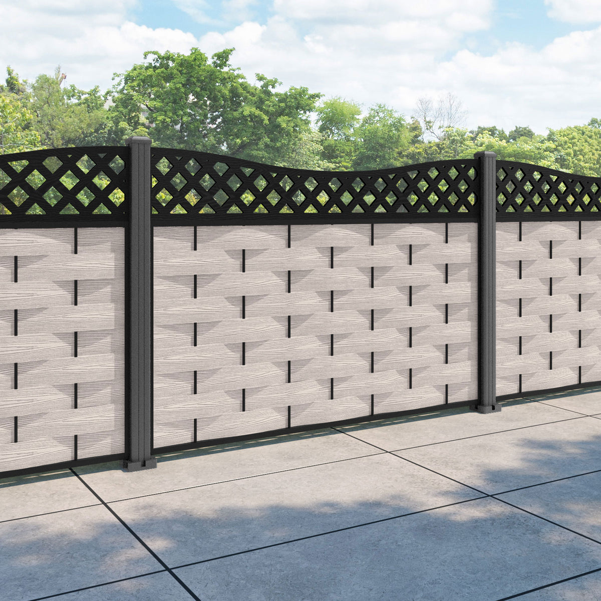 Ripple Low Wave Curved Top Fence Panel Mid Stone - with our aluminium posts