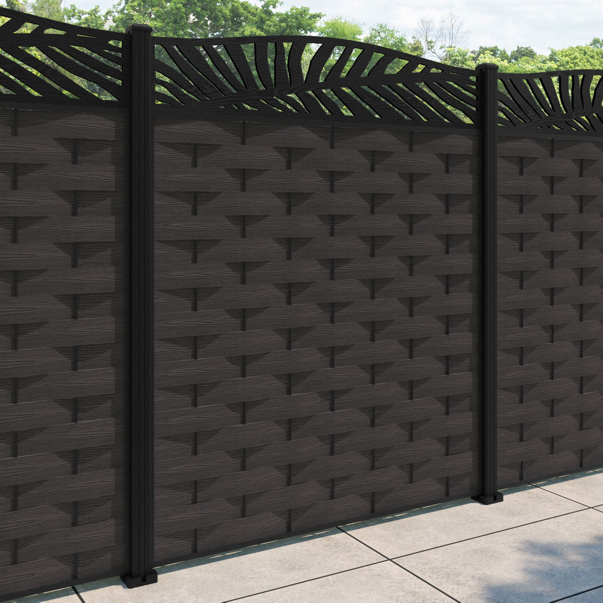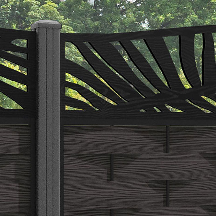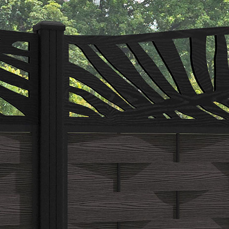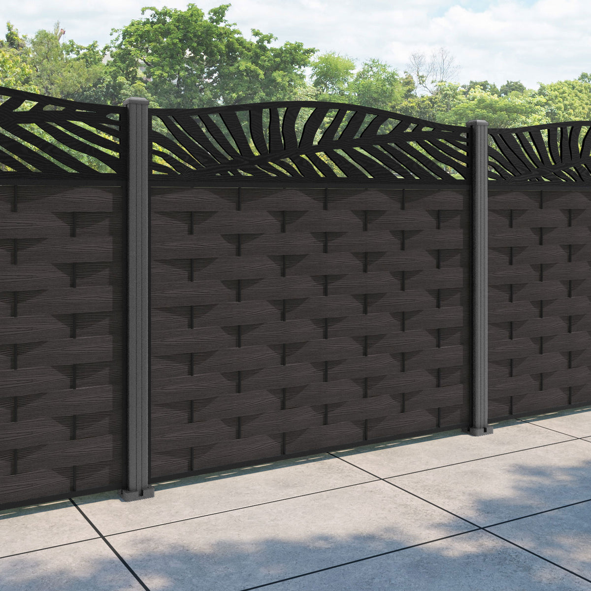 Ripple Palm Curved Top Fence Panel Dark Oak - with our aluminium posts