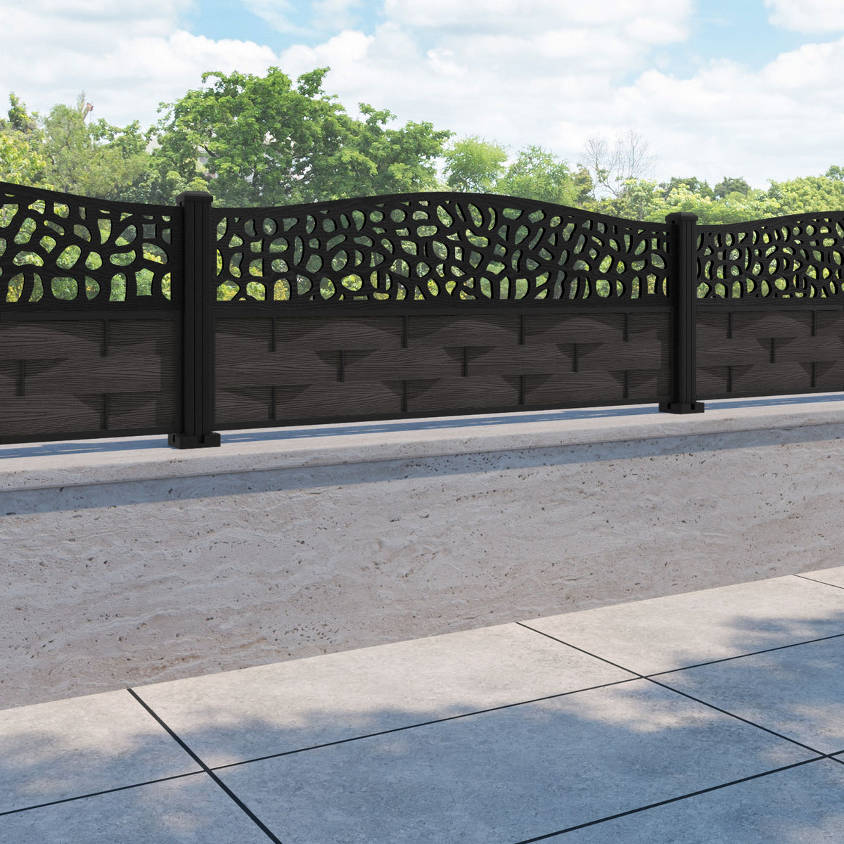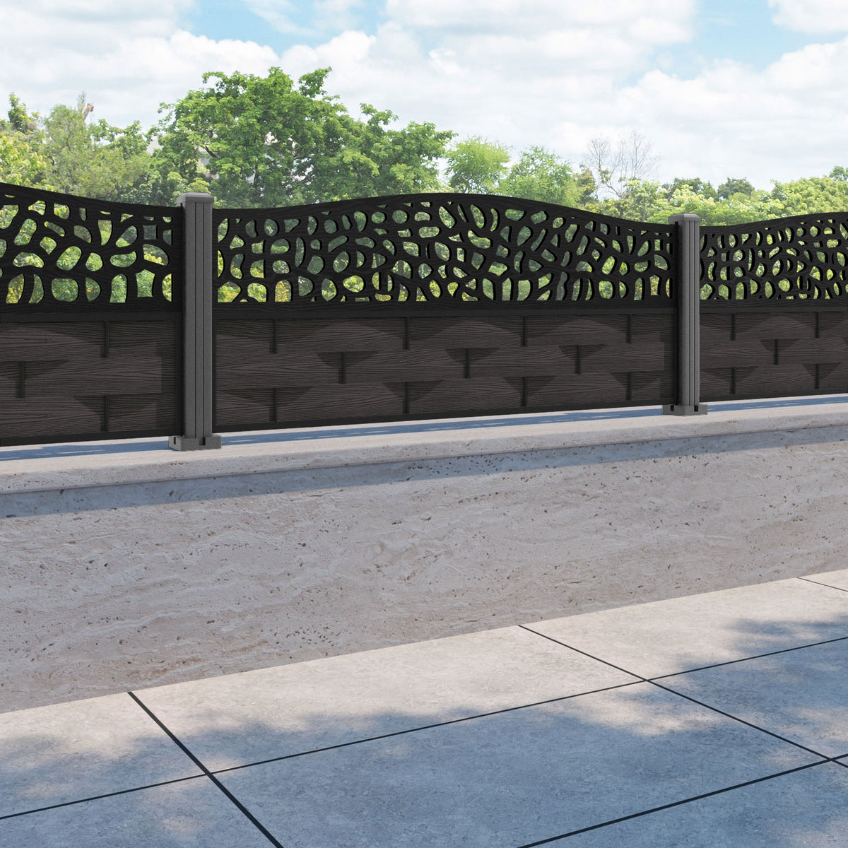 Ripple Pebble Curved Top Fence Panel Dark Oak - with our aluminium posts