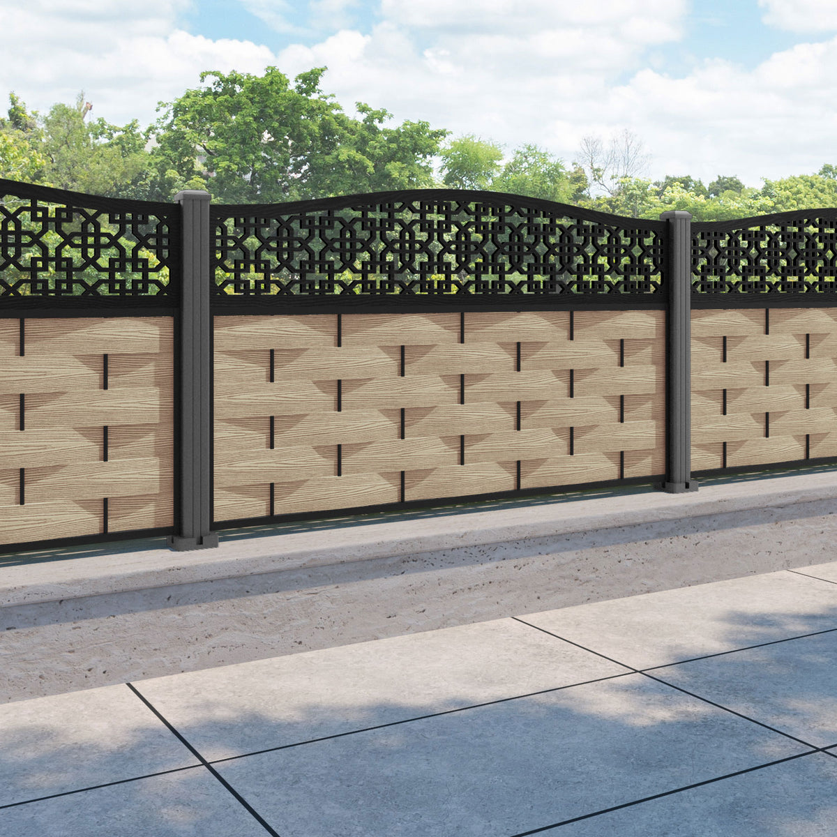 Ripple Zaria Curved Top Fence Panel Light Oak - with our aluminium posts