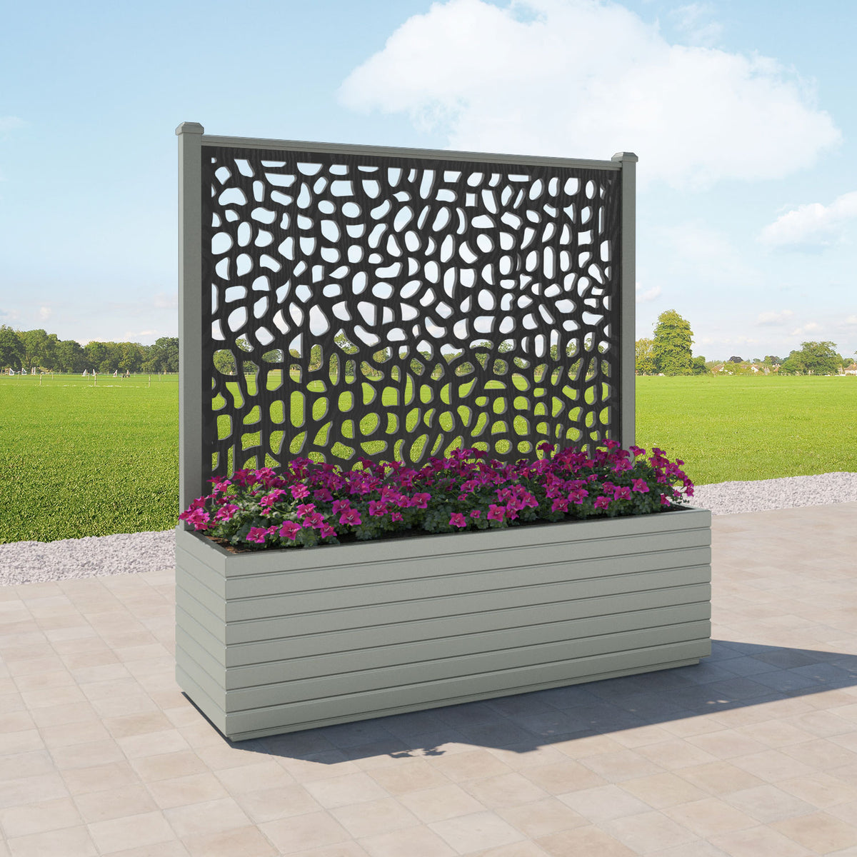 The planters are available in 6 different sizes and can be paired with any of our decorative screens that are available in 5 different colour options. The screens can be fixed at the back or in the centre of the planter. The centre option enables you to plant on both sides of the screen. They can also be ordered with a wheeled base for convenience, with lockable wheels for stability.