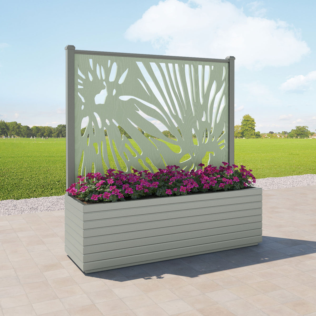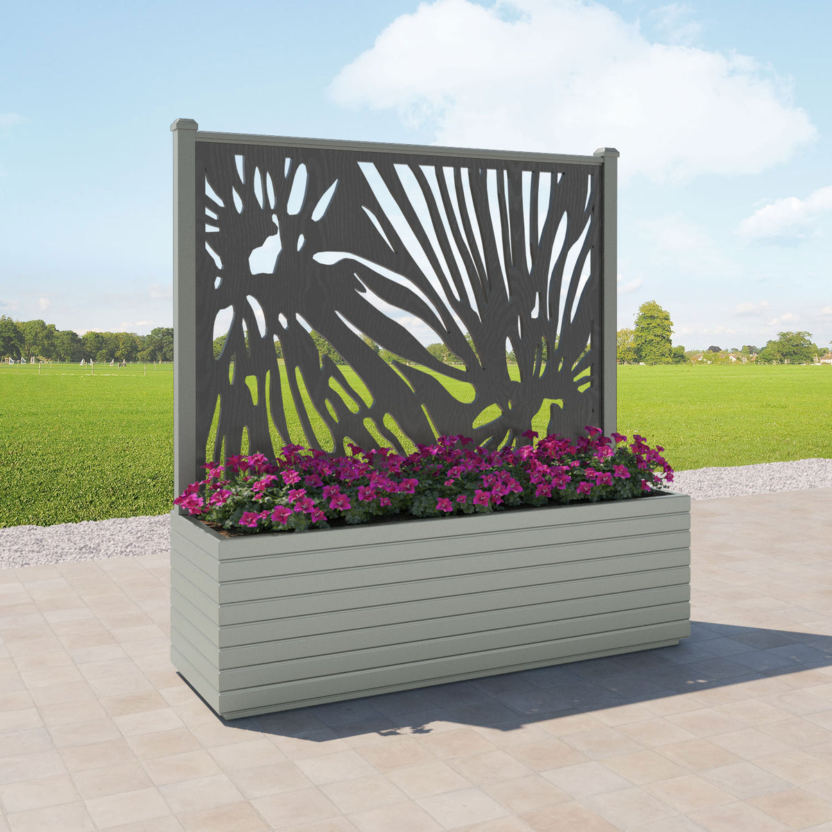 The planters are available in 6 different sizes and can be paired with any of our decorative screens that are available in 5 different colour options. The screens can be fixed at the back or in the centre of the planter. The centre option enables you to plant on both sides of the screen. They can also be ordered with a wheeled base for convenience, with lockable wheels for stability.