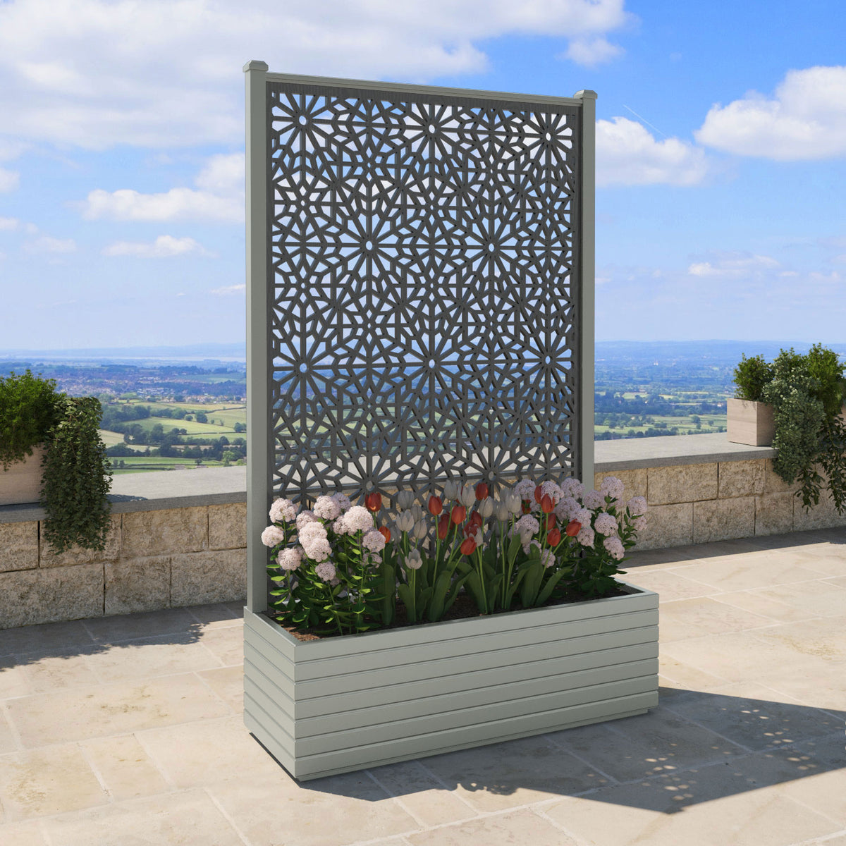 The planters are available in 6 different sizes and can be paired with any of our decorative screens that are available in 5 different colour options. The screens can be fixed at the back or in the centre of the planter. The centre option enables you to plant on both sides of the screen. They can also be ordered with a wheeled base for convenience, with lockable wheels for stability.
