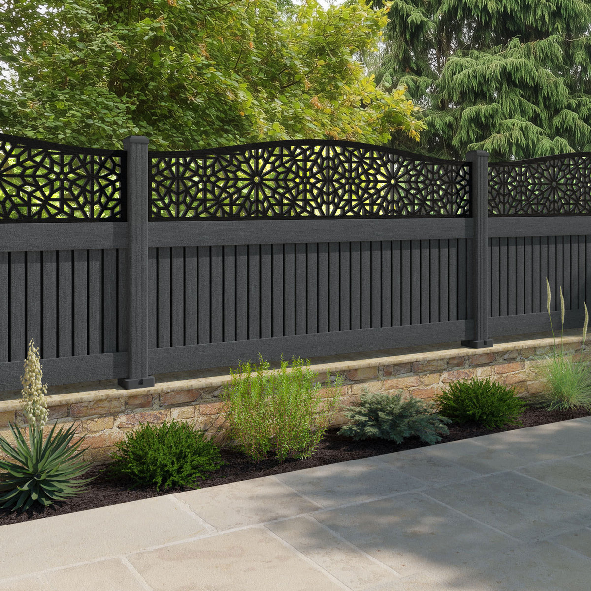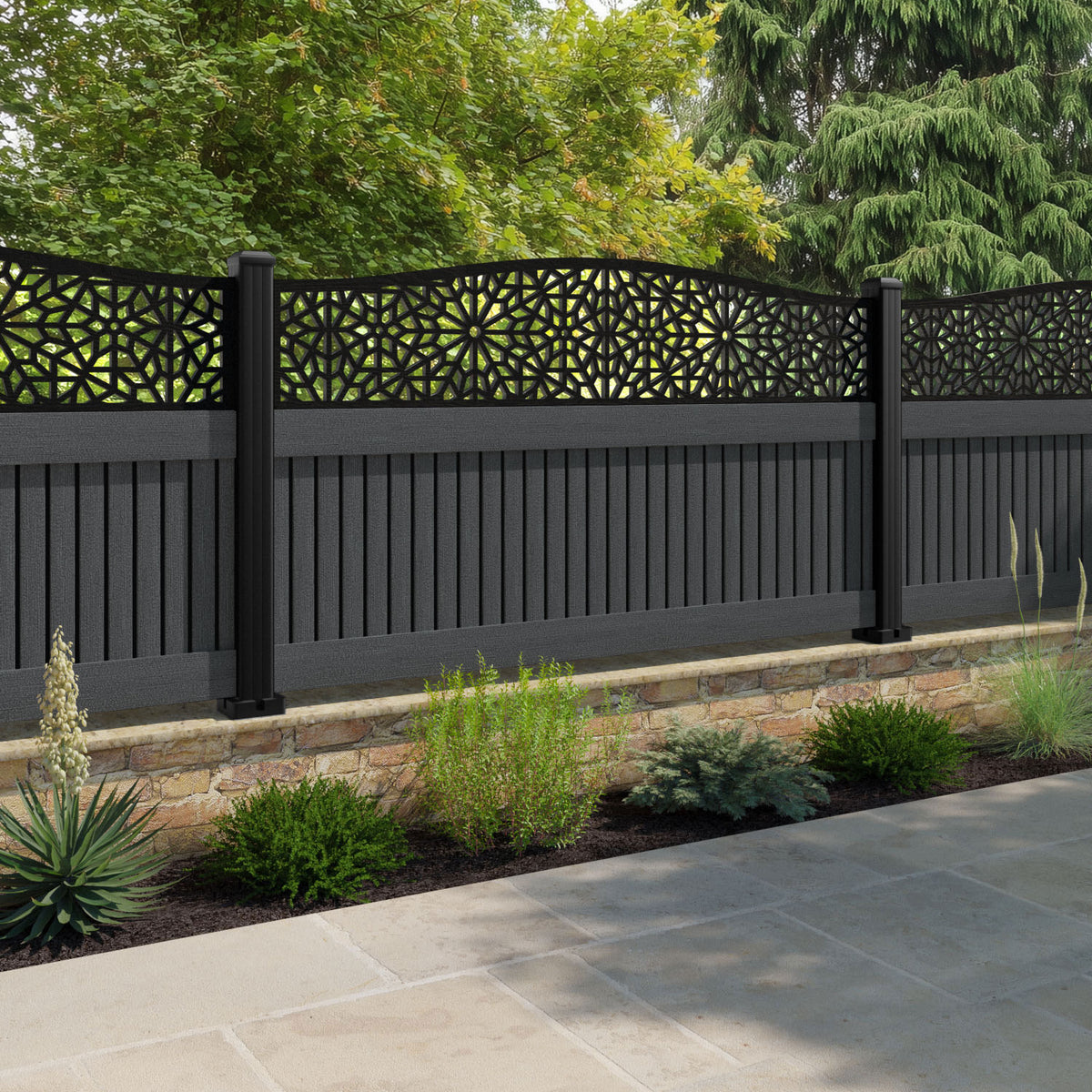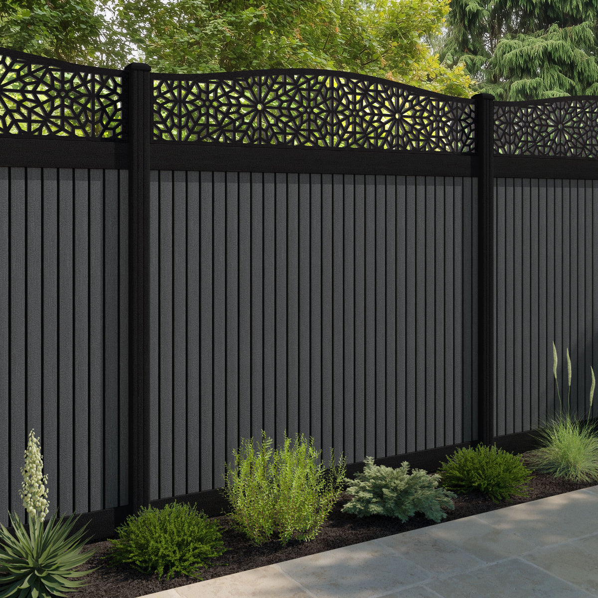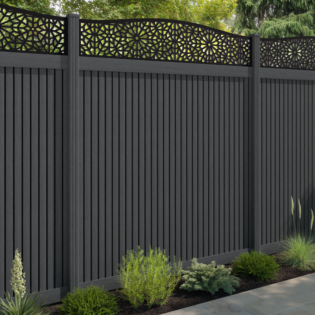 Virtis Alnara Curved Top Fence Panel Dark Grey - with our composite posts