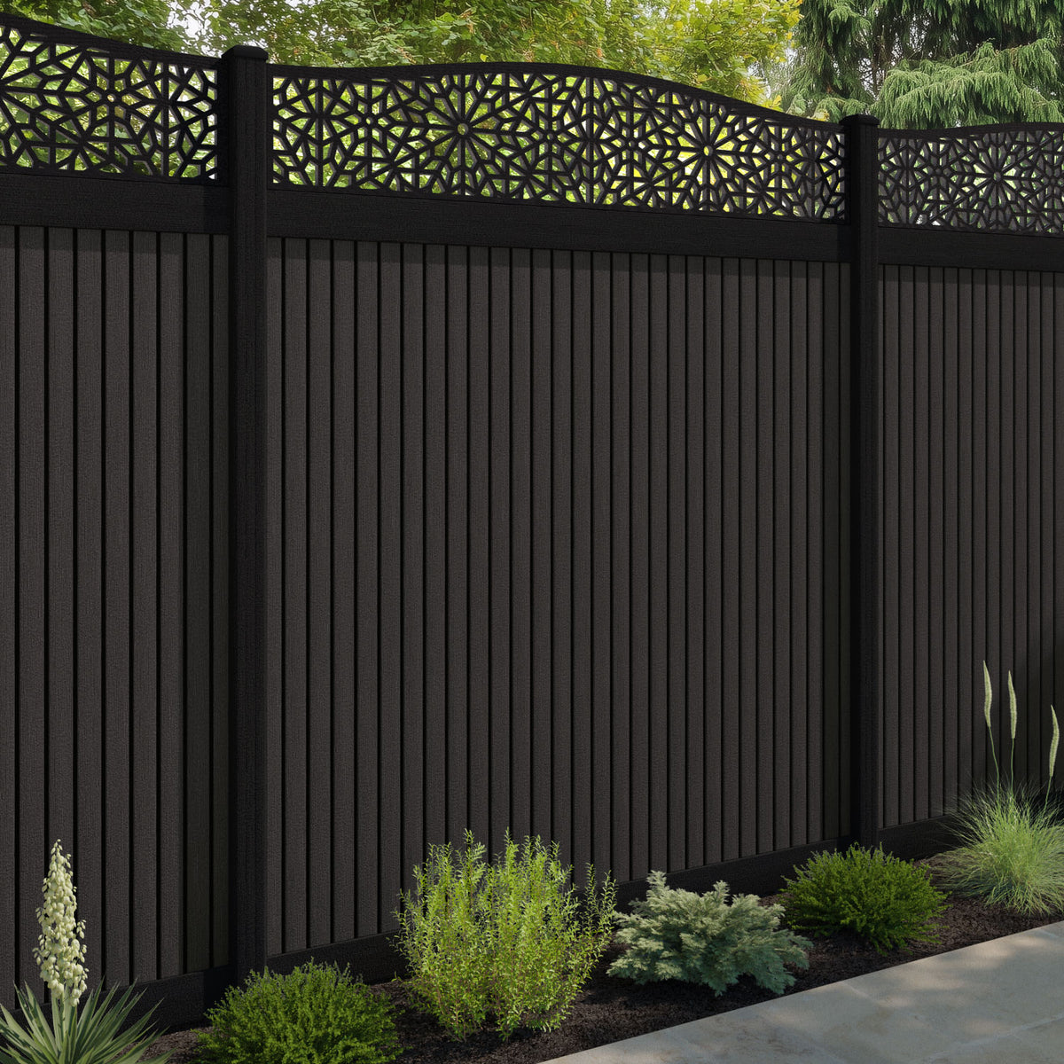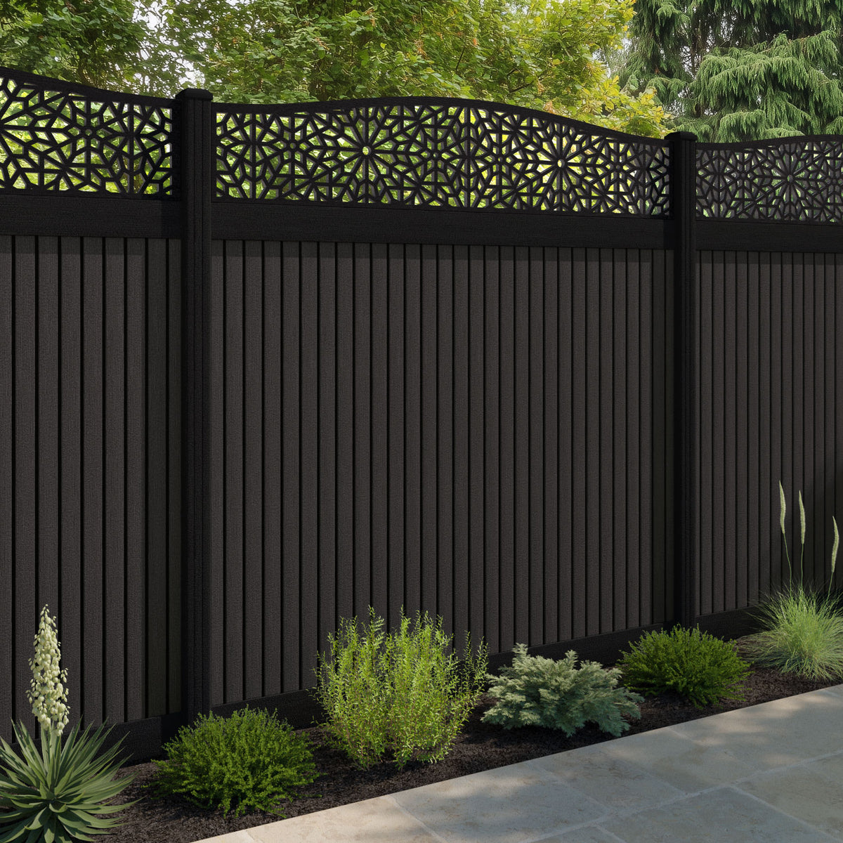 Virtis Alnara Curved Top Fence Panel Dark Oak - with our aluminium posts