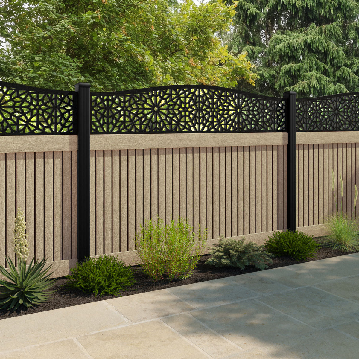 Virtis Alnara Curved Top Fence Panel Light Oak - with our aluminium posts