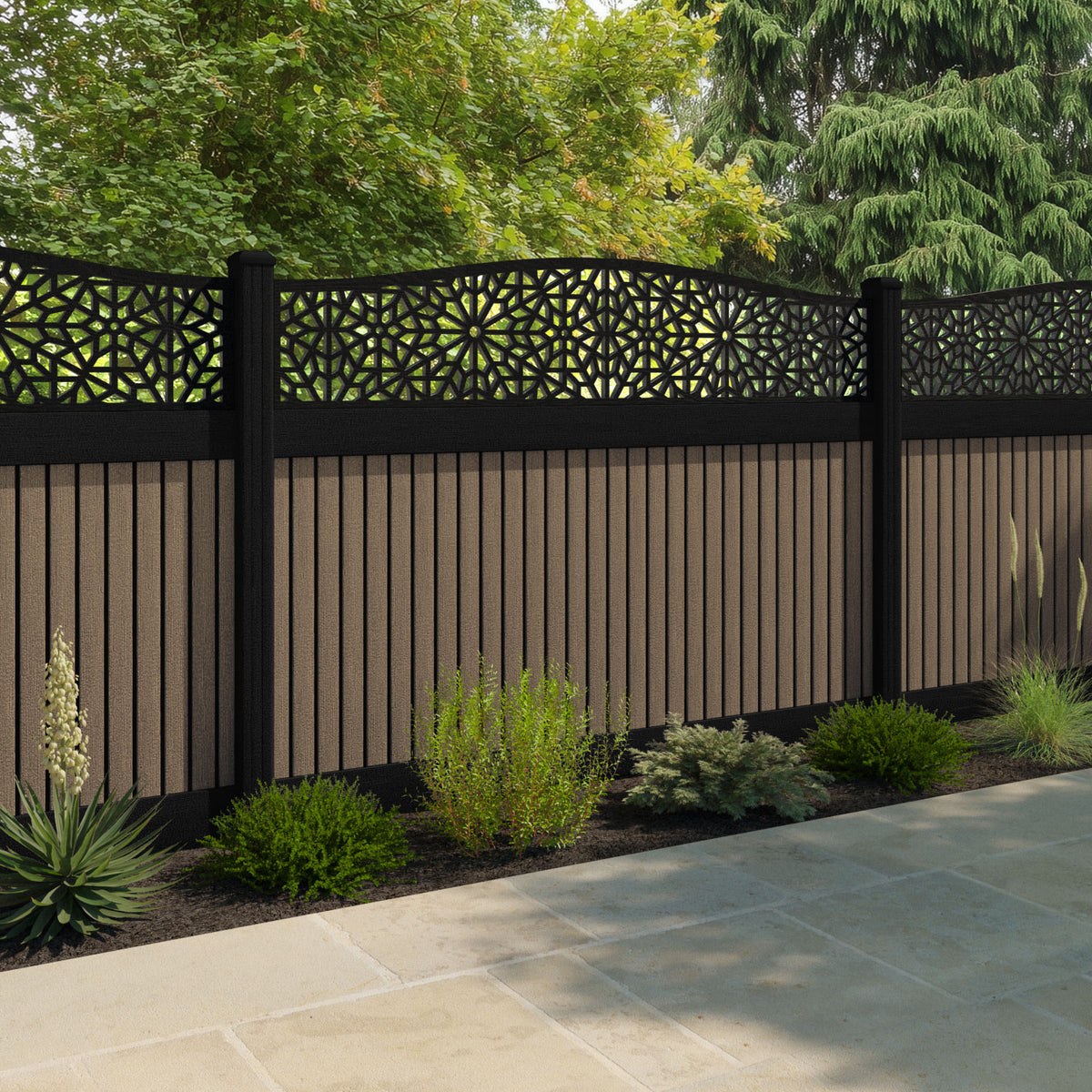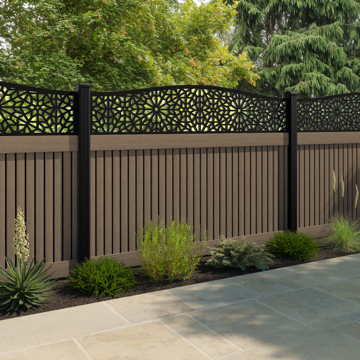 Virtis Alnara Curved Top Fence Panel Teak - with our aluminium posts