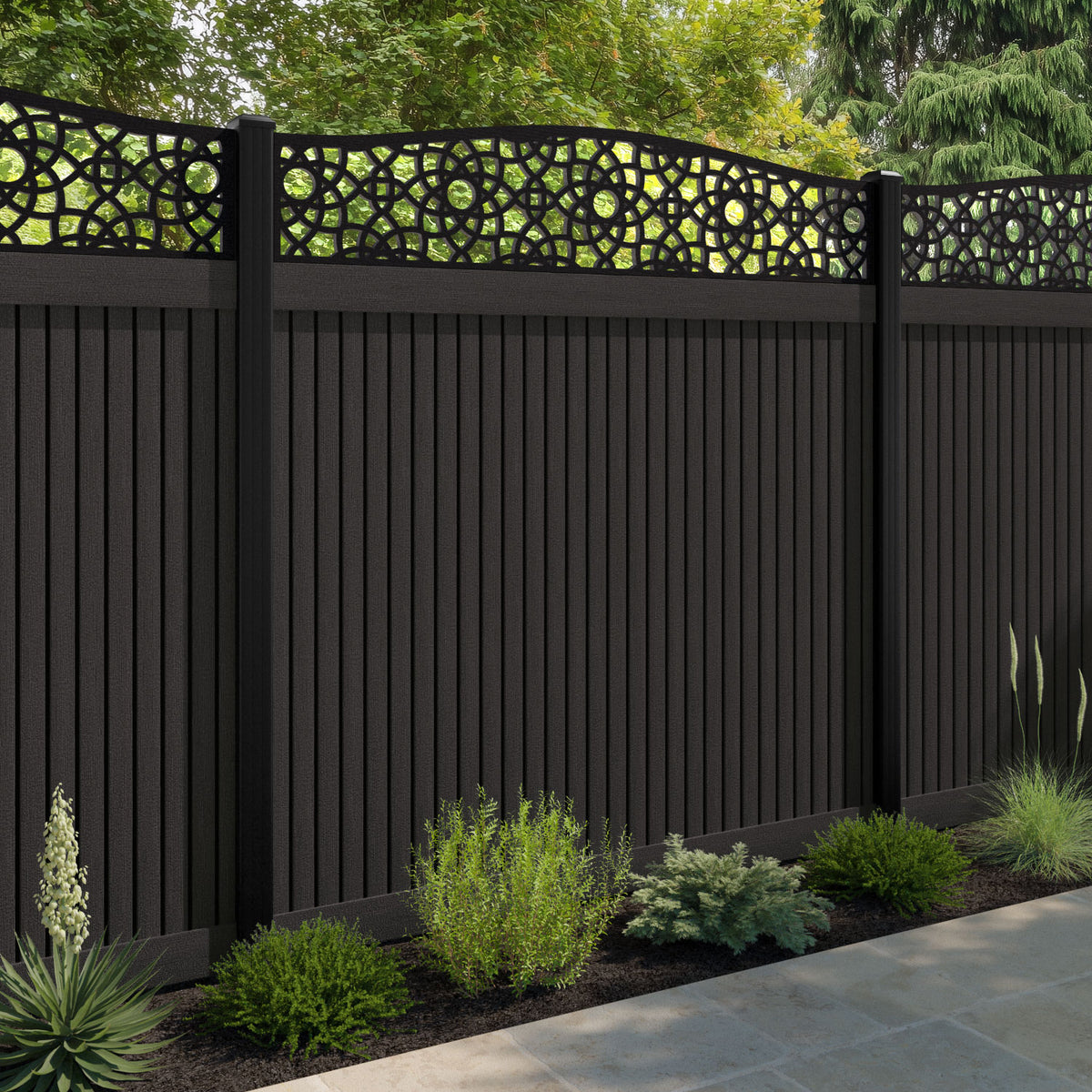 Virtis Ambar Curved Top Fence Panel Dark Oak - with our aluminium posts