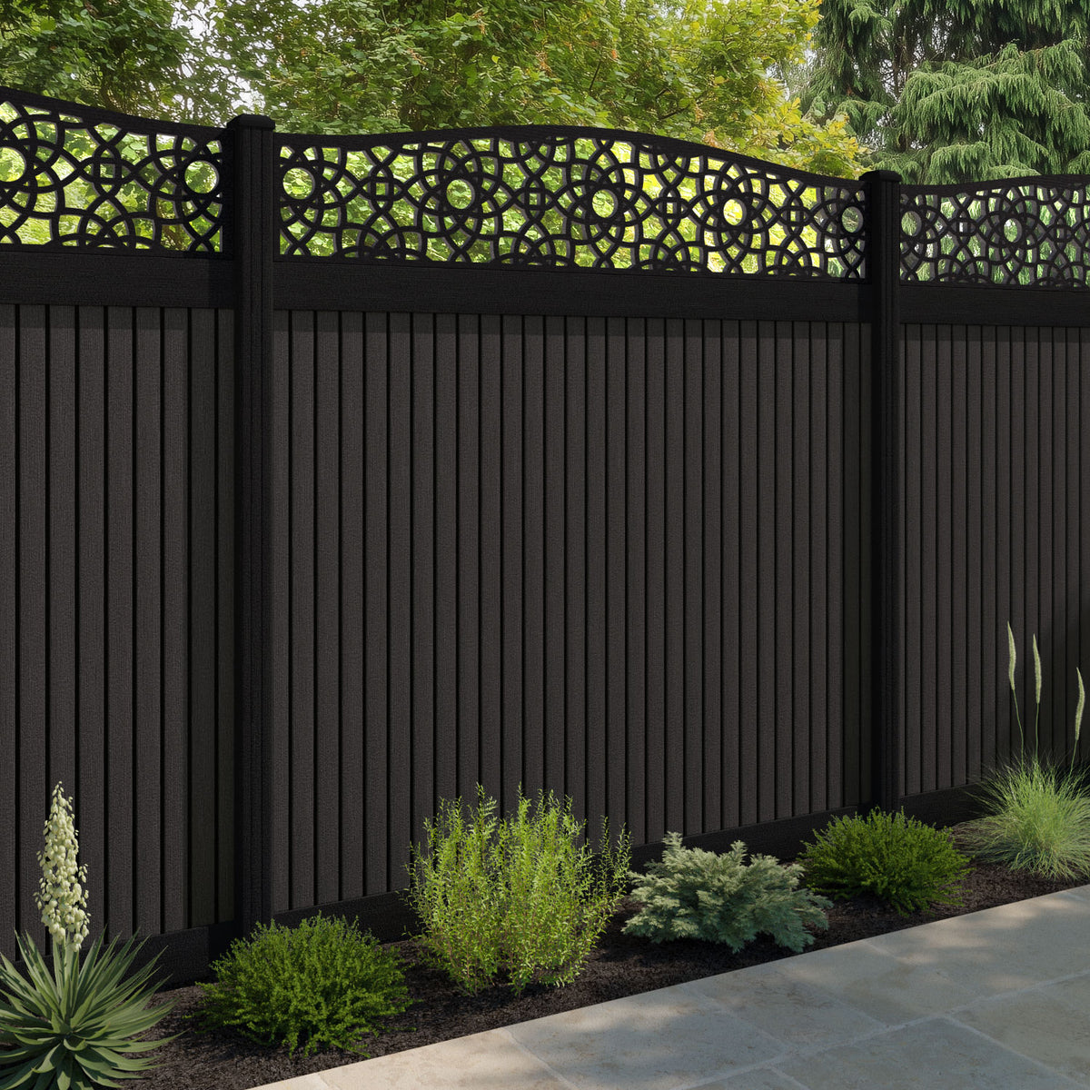 Virtis Ambar Curved Top Fence Panel Dark Oak - with our composite posts