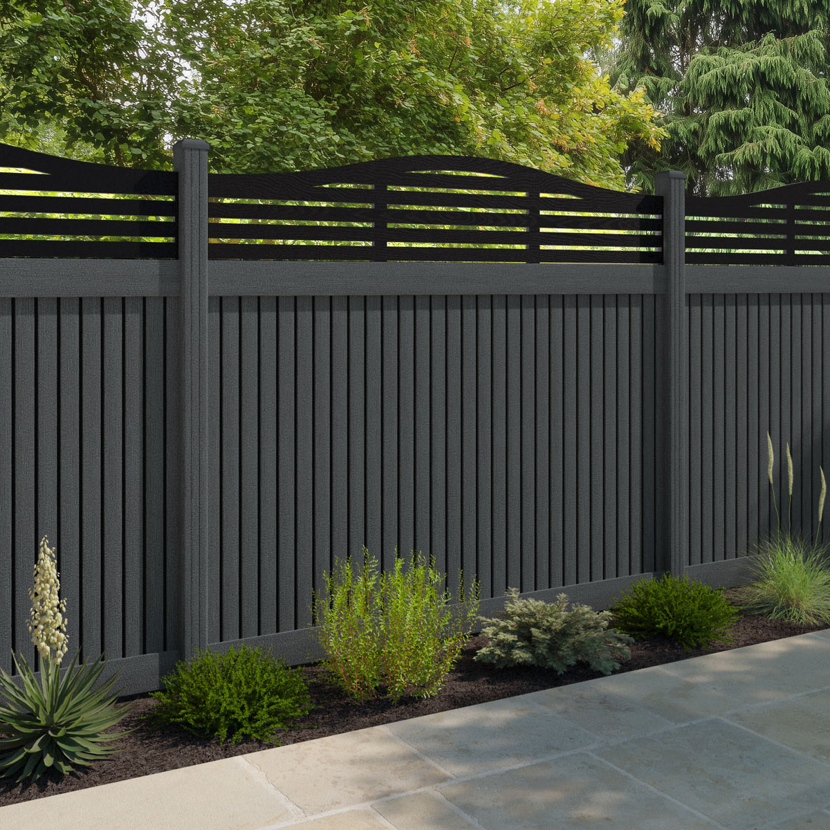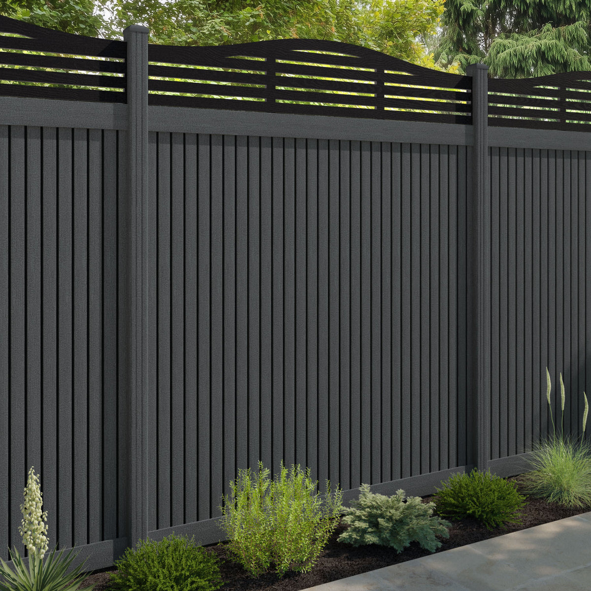 Virtis Aspen Curved Top Fence Panel Dark Grey - with our composite posts