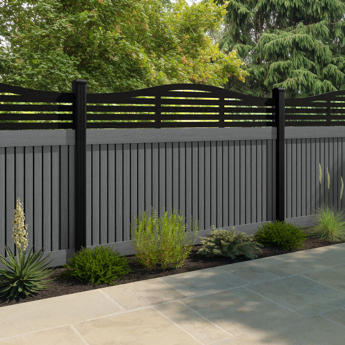 Virtis Aspen Curved Top Fence Panel Mid Grey - with our aluminium posts