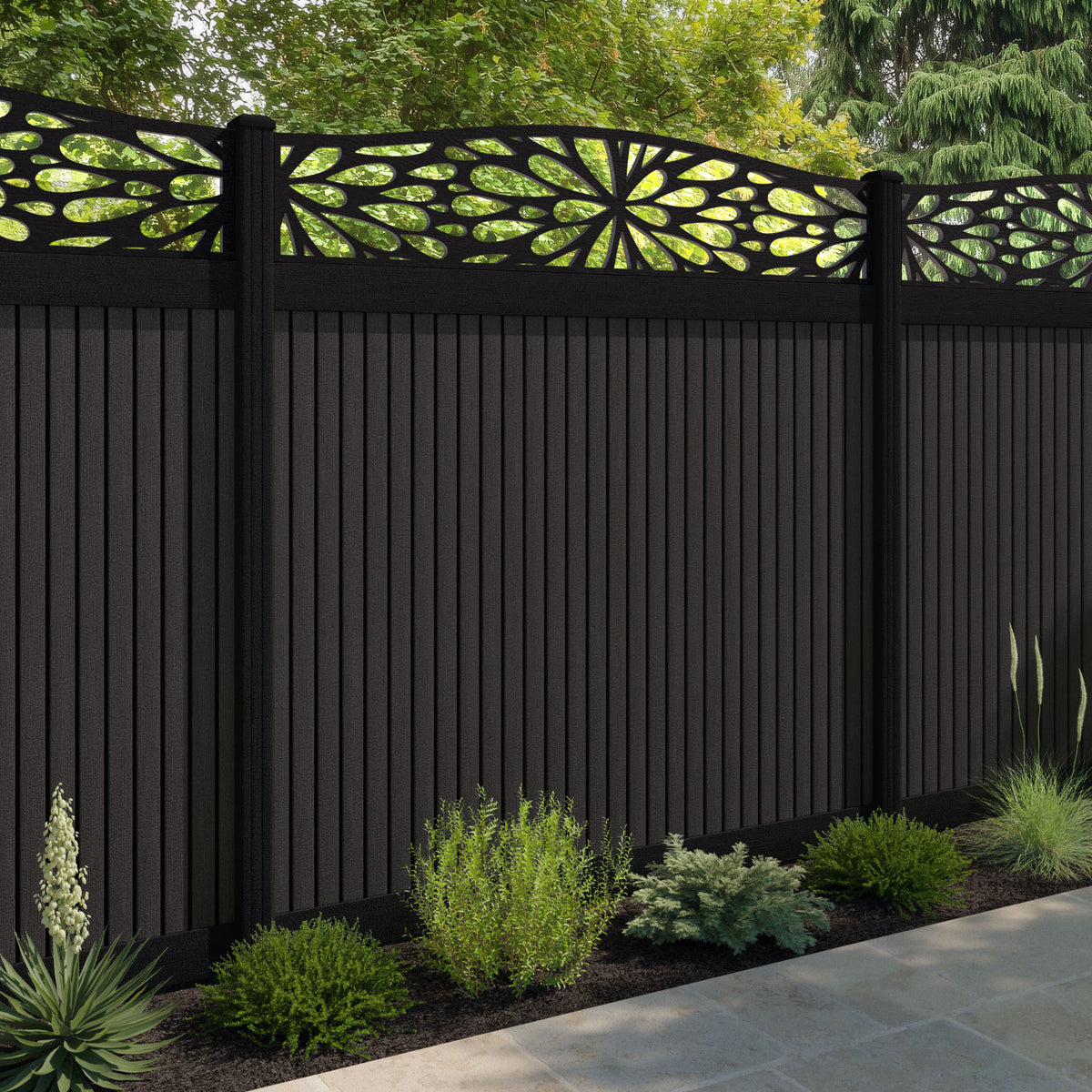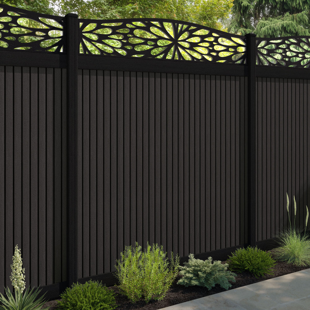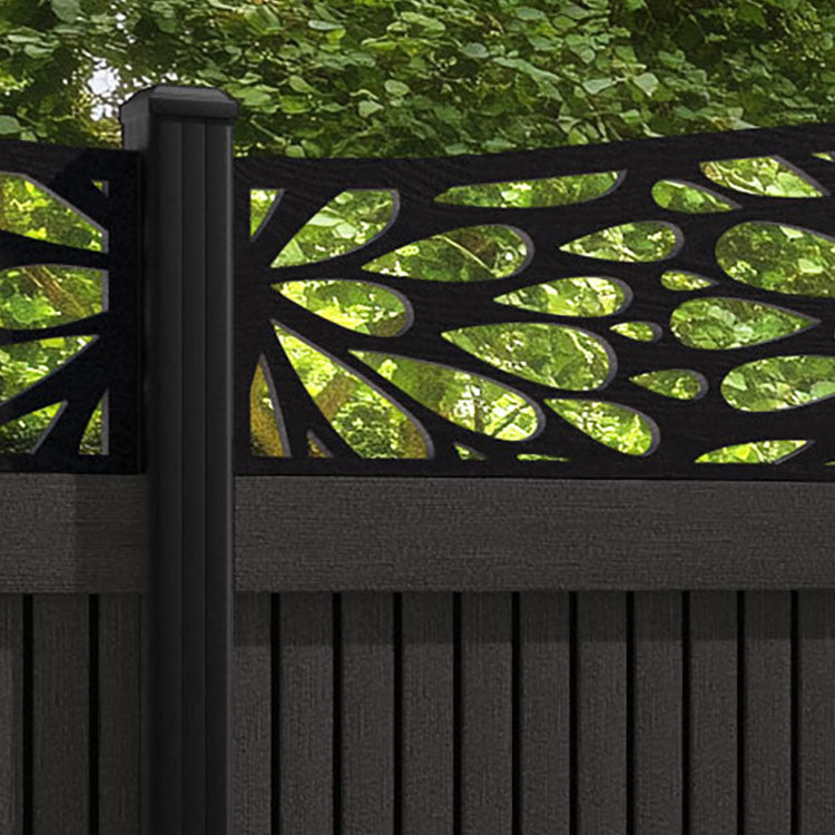 Virtis Blossom Curved Top Fence Panel Dark Oak - with our aluminium posts